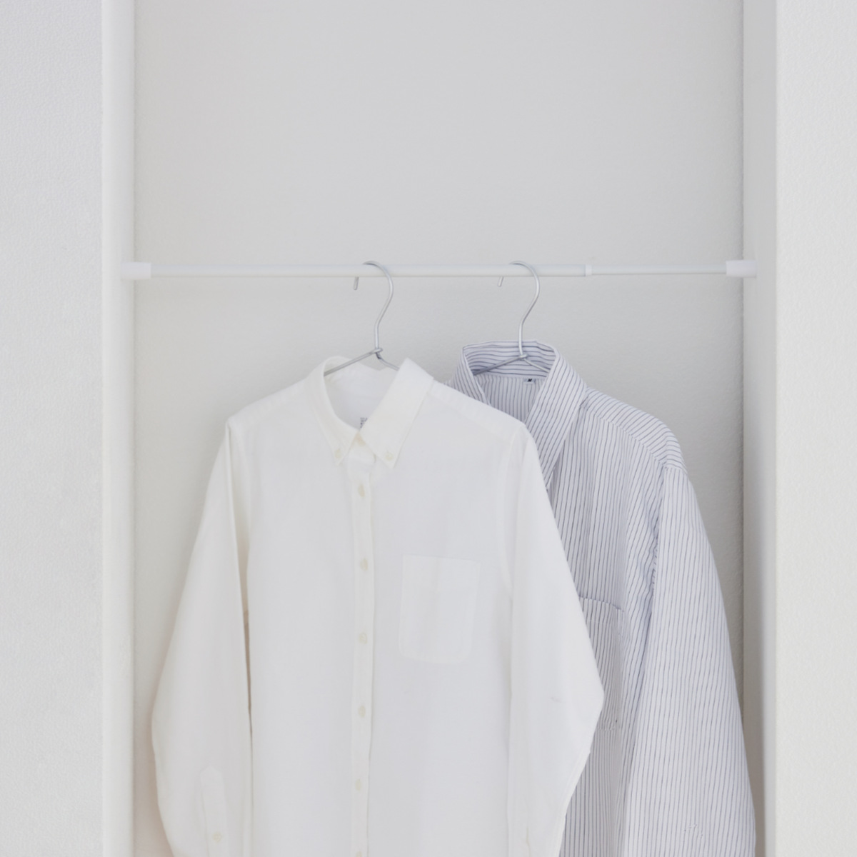 暮らしにフィットするシンプルなつっぱり棒 55〜80cm様々なテイストに馴染むシンプルなつっぱり棒です。マットな質感のホワイトなので落ち着いた雰囲気になっています。お家の中のデットスペースを利用して収納力をアップできるので、クローゼットやキッチン、ランドリーなど様々な場所で大活躍してくれます。