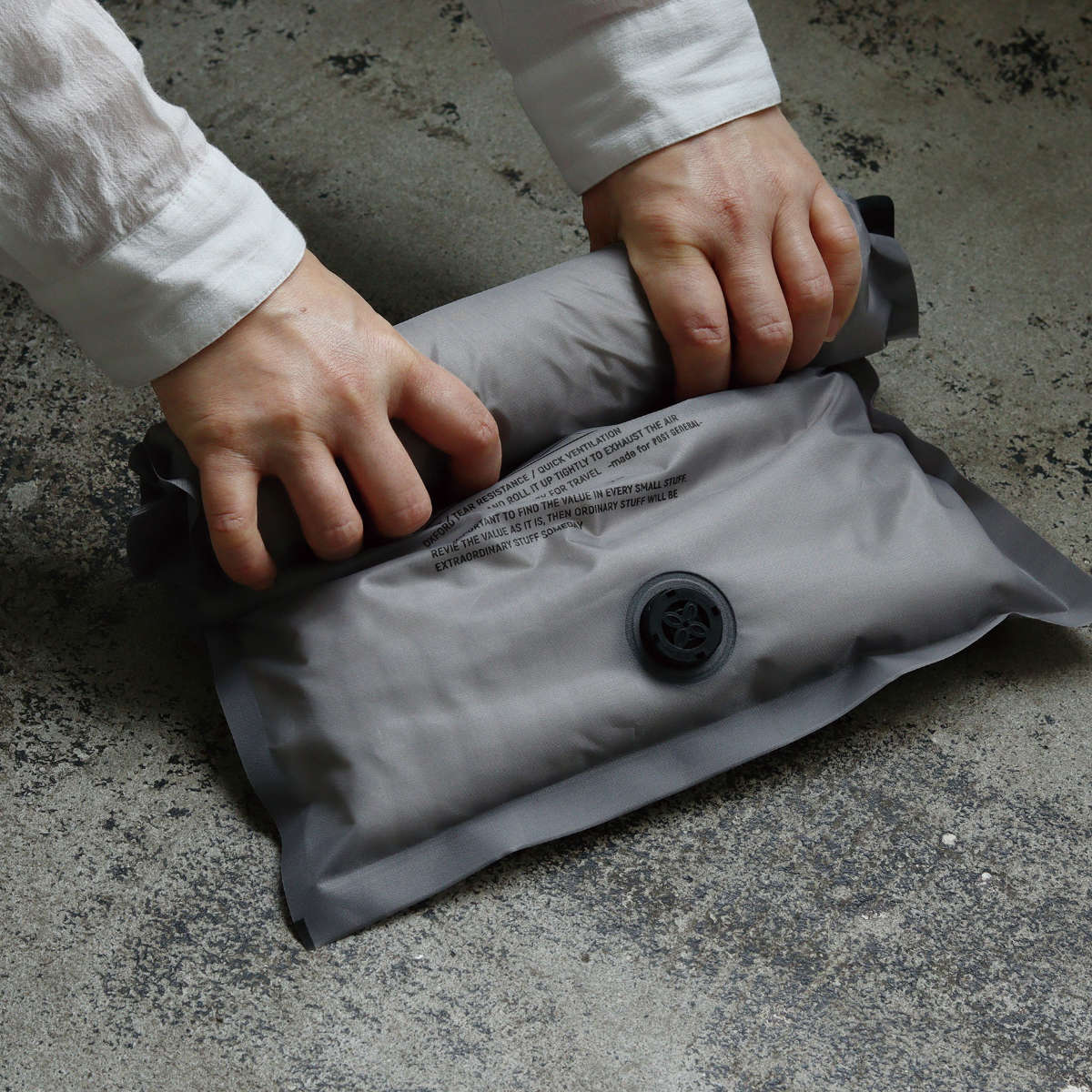 簡単に圧縮できる袋の上部をスライダーで閉じ、手で袋を丸めて中の空気をロック式排気弁から排出することで圧縮できます。掃除機を使わずに手で簡単に圧縮できるので、旅先などで重宝します。安定的に空気が抜ける仕様となっています。
