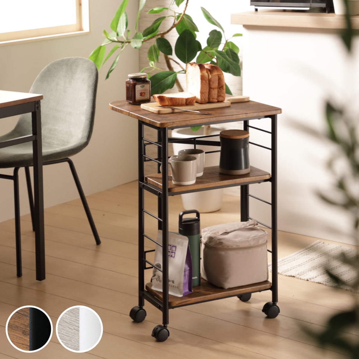 ![]() 広げて使える バタフライワゴン | ![]() スペースを活用 ゴミ箱上ラック | ![]() ひとまとめに収納 レンジワゴン |