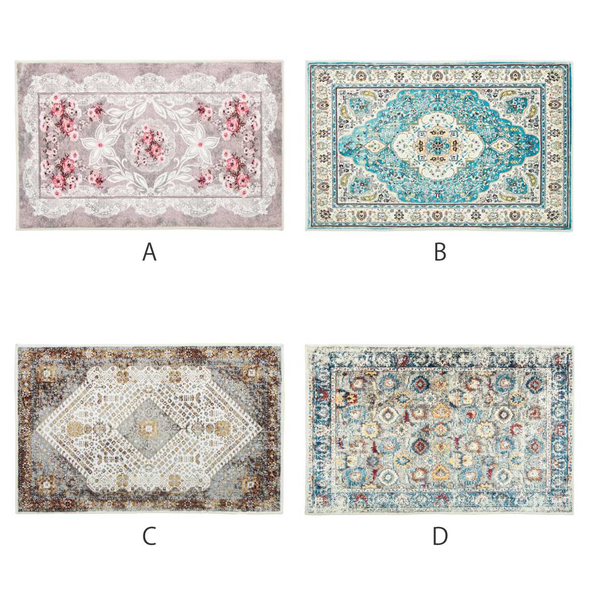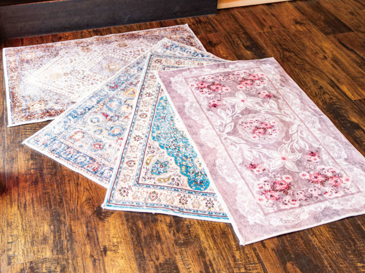 裏面はすべりにくく安心な素材室内での使用を前提にしております。裏面は、すべりにくいTPR素材なので、安全・快適にお使いいただけます。4柄ありますので、インテリアの雰囲気や、敷きたい場所に合わせてお選びいただけます。