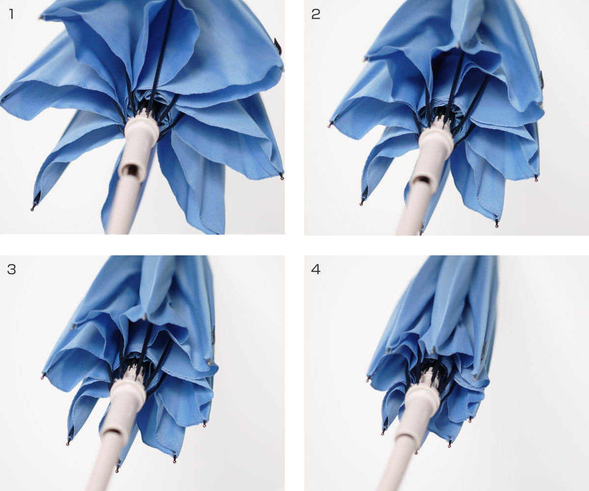閉じる動きに連動して骨が回転し、軸を中心に生地がくるくると巻き込まれます。最後に手で生地をまとめたり、ベルトで留める必要がなく、手を濡らさずに素早く傘をたたむことができます。