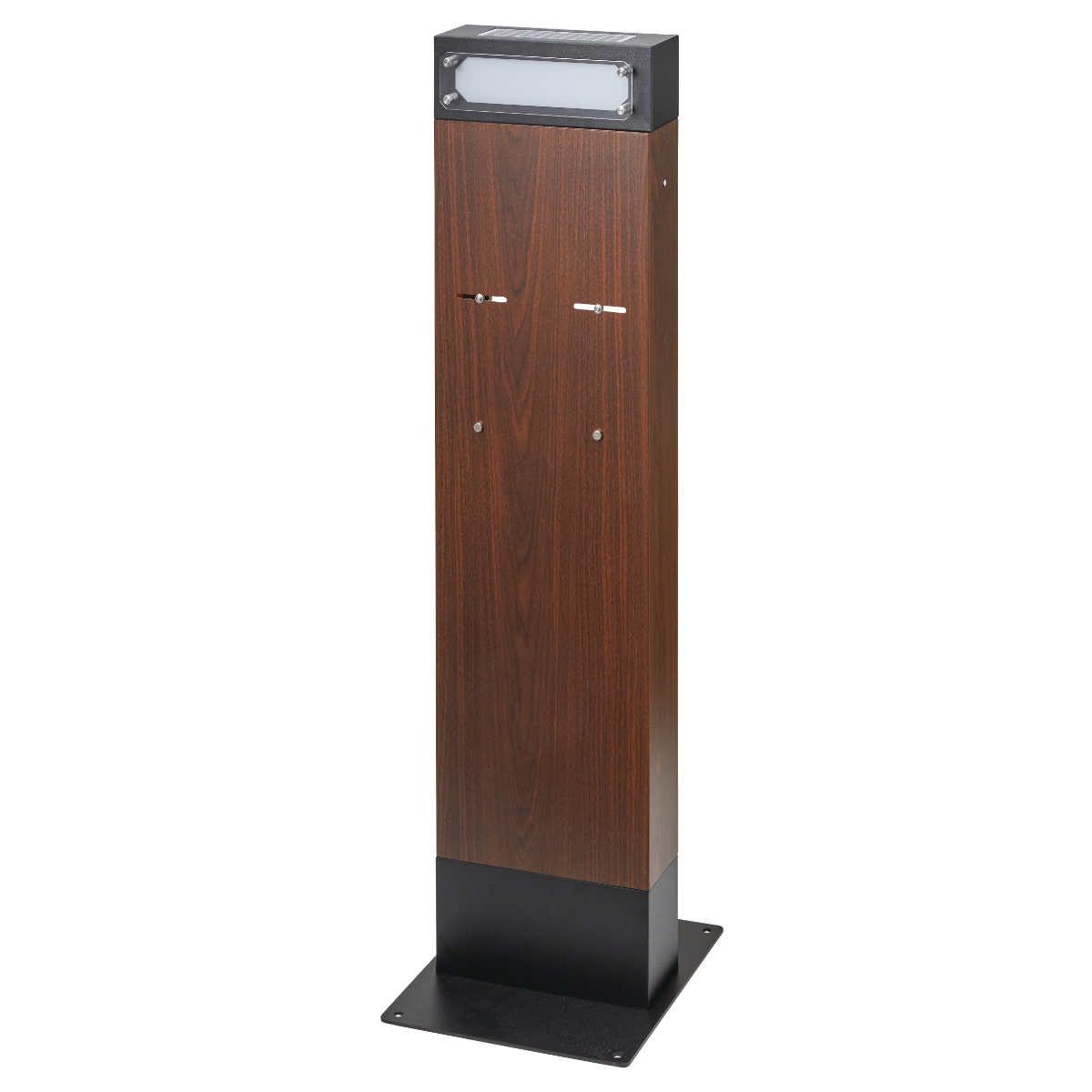 枕木のような木目のポスト用スタンド 【ネームライト付き】壁掛け用のポストを取り付けて使用する、ポスト用スタンドです。スタンドを利用することで、壁掛けポストがスタンドポストに変わります。枕木のようなデザインと木目調の質感で高級感漂う佇まいです。