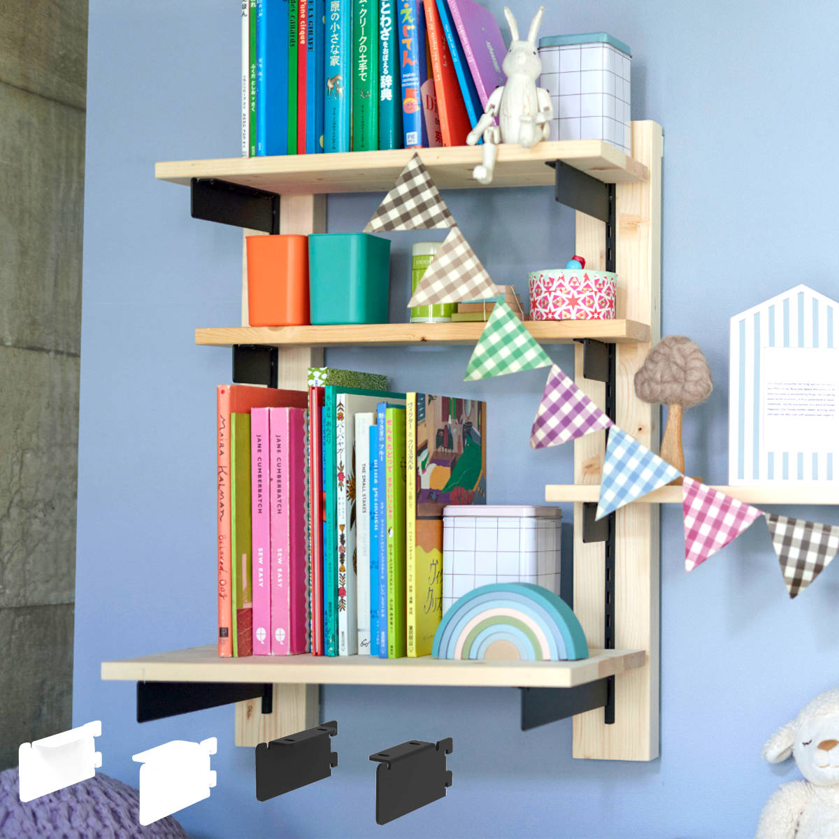 可動式で棚の高さも思いのまま「棚受 10cm」は、1×4材を1枚乗せるだけで簡単に棚が作れます。レールの間隔は2.5cm刻みなので、収納物によって高さを変えることができ、収納したいものが変わっても自由に棚の高さを変えられます。