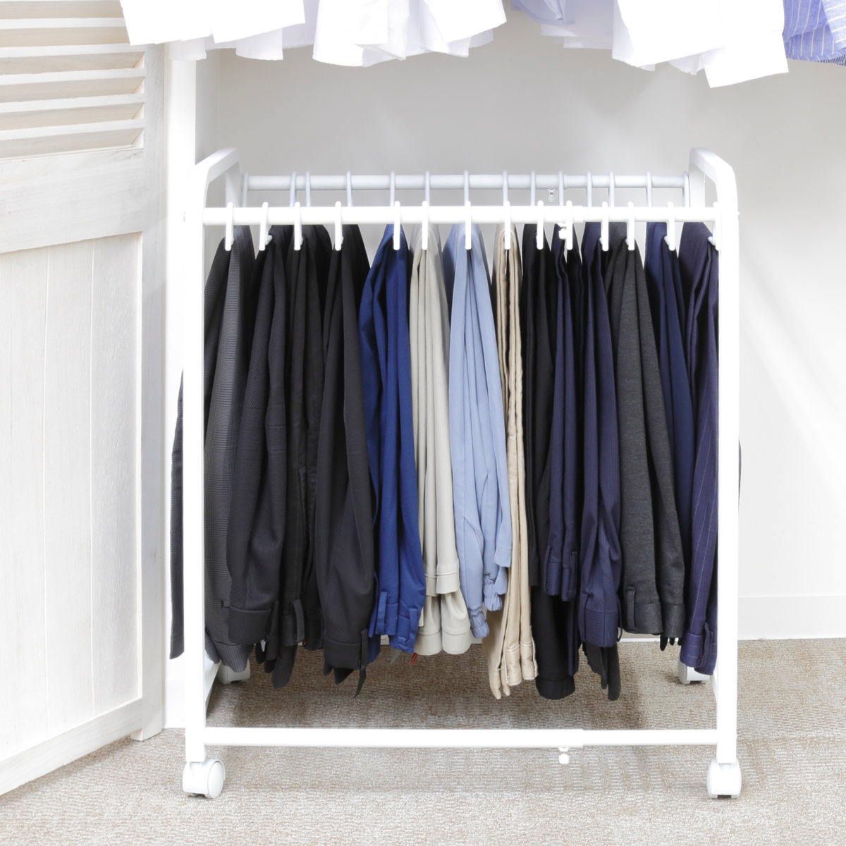 フレームは強度のある丈夫なスチール製です。荷重を前後に分散させるハンガーを掛ける2本のバーと、全体の重みをしっかり支える本体の4本脚からなる頑丈設計で、高い耐久性を実現しています。重みのあるパンツやスラックスも安心して収納できます。
