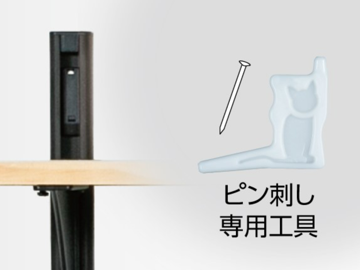 ピンと専用工具が付属しており、ピンを差し込むだけでしっかり固定できます。穴が目立ちにくいため、賃貸住宅でも安心して使用できます。