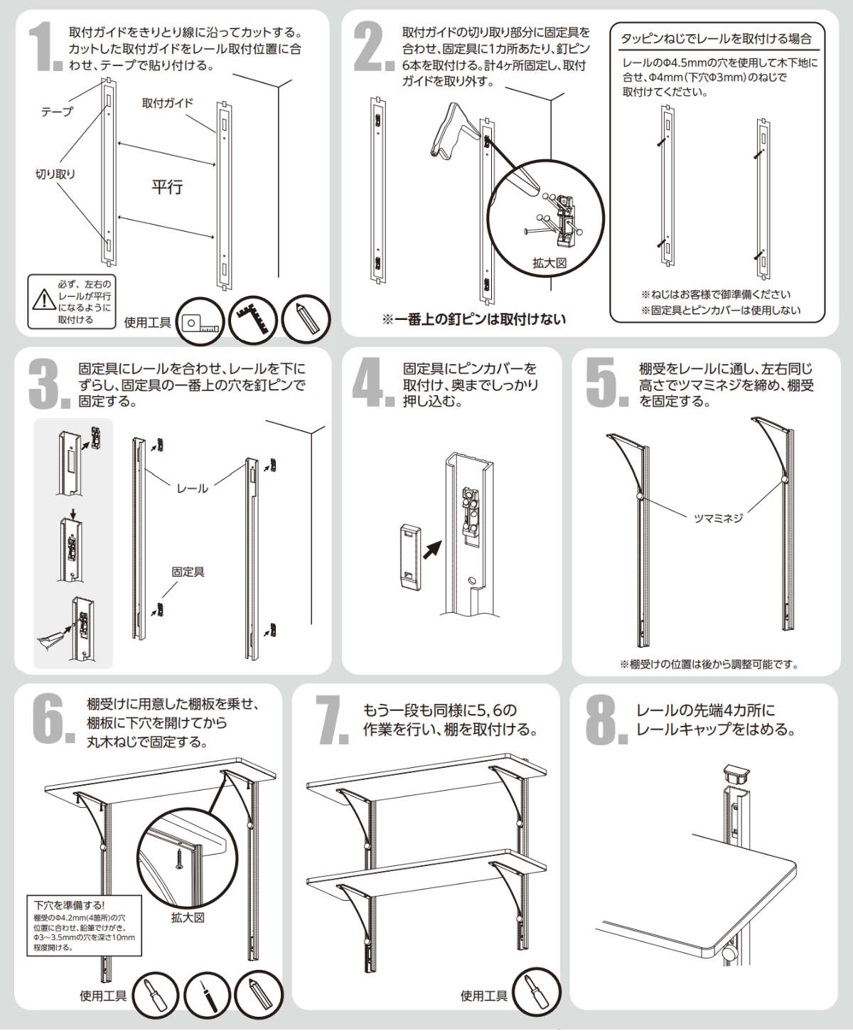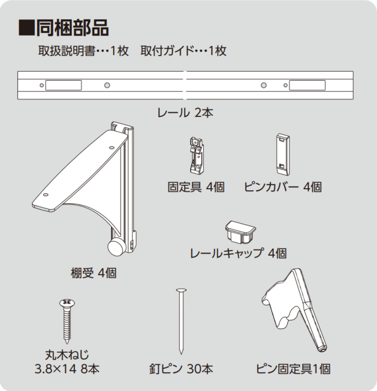 付属品:レール×2、棚受×4、レールキャップ×4、固定具×4、ピンカバー×4、ピン固定具×1、丸木ねじ(3.8×14)×8、釘ピン×30、取扱説明書×1、取付ガイド×1