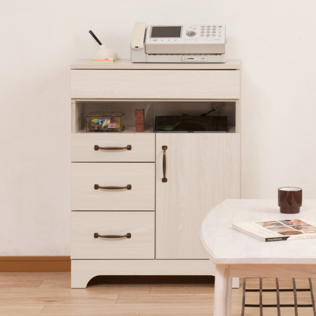 「Late」シリーズのFAX&TELキャビネットです。ホワイトウォッシュの木目のシートは、傷がつきにくい硬度の高いプリント強化紙を使用しており、うっすら見える木目がお部屋をお洒落に演出します。シンプルで圧迫感なくお部屋に溶け込みます。