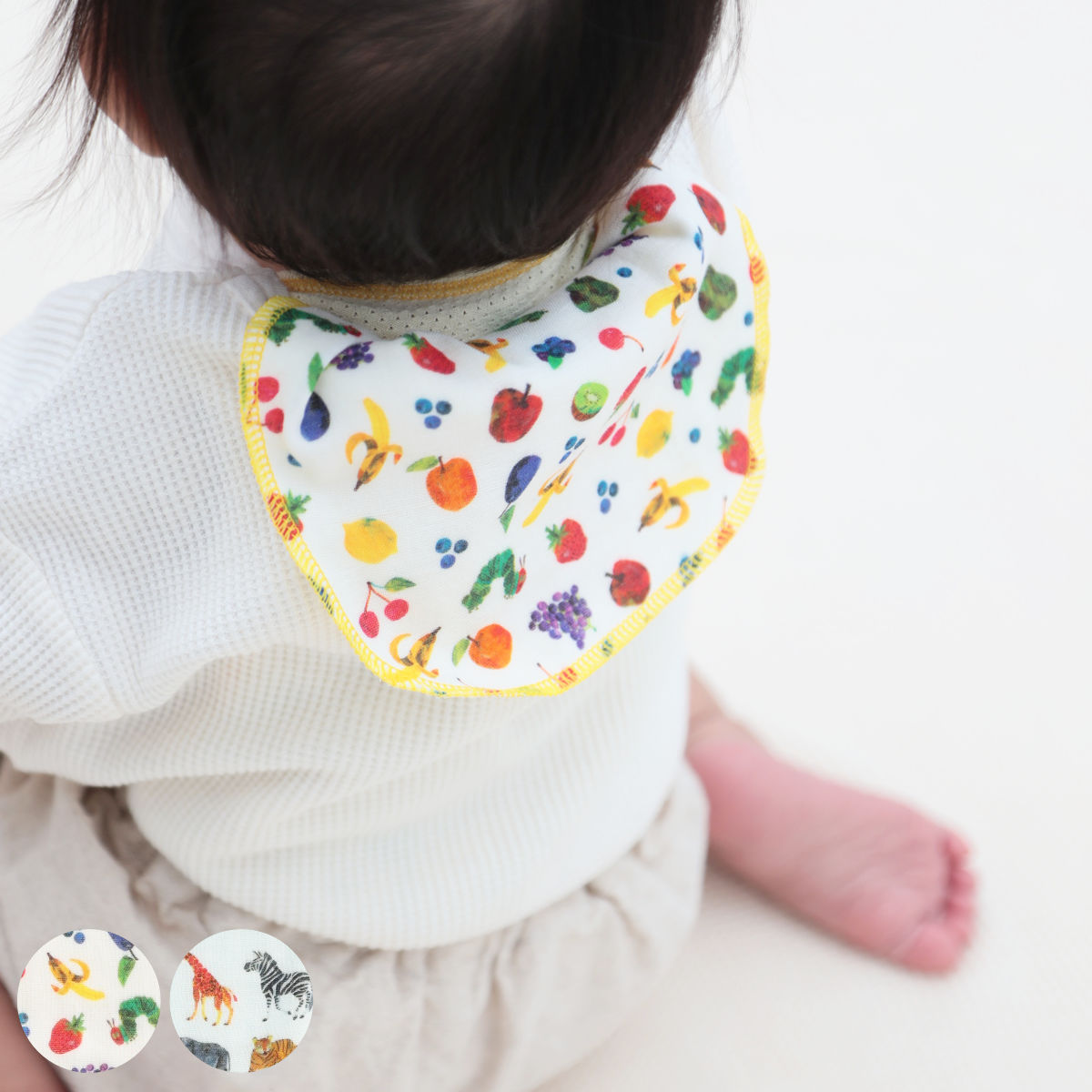 「はらぺこあおむし」とフルーツやサファリの動物たちが描かれた、ユニセックスなデザインが魅力です。ちょっとしたプレゼントとしてもおすすめです。
