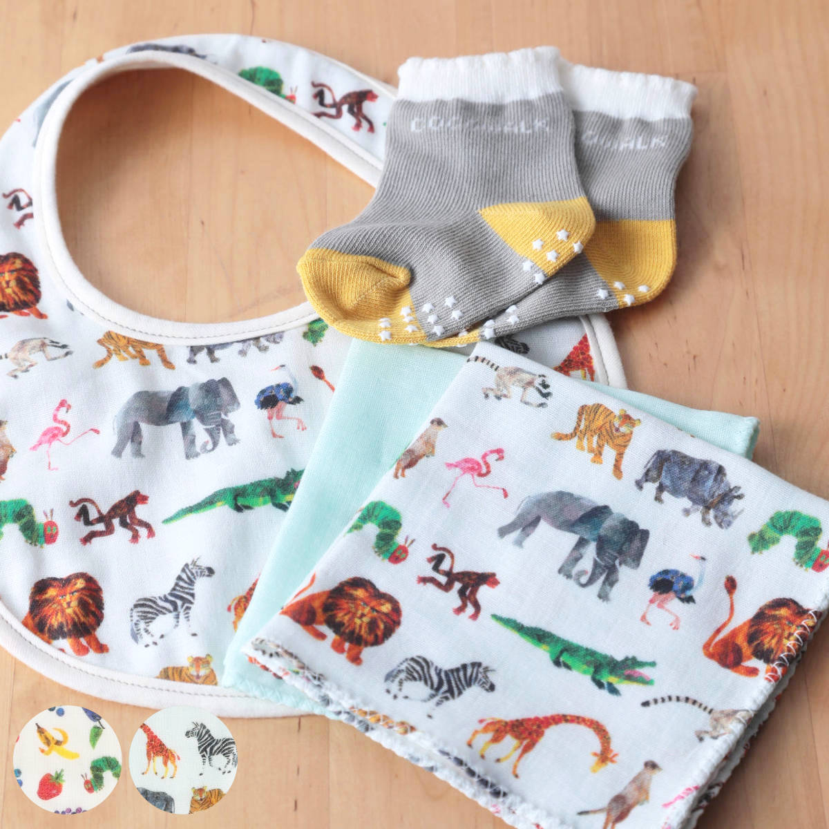 出産のお祝いにぴったり、はらぺこあおむしの可愛いギフトセット●人気絵本「はらぺこあおむし」のデザインが可愛いスタイとハンカチ2枚、ソックスが入ったギフトセットです。