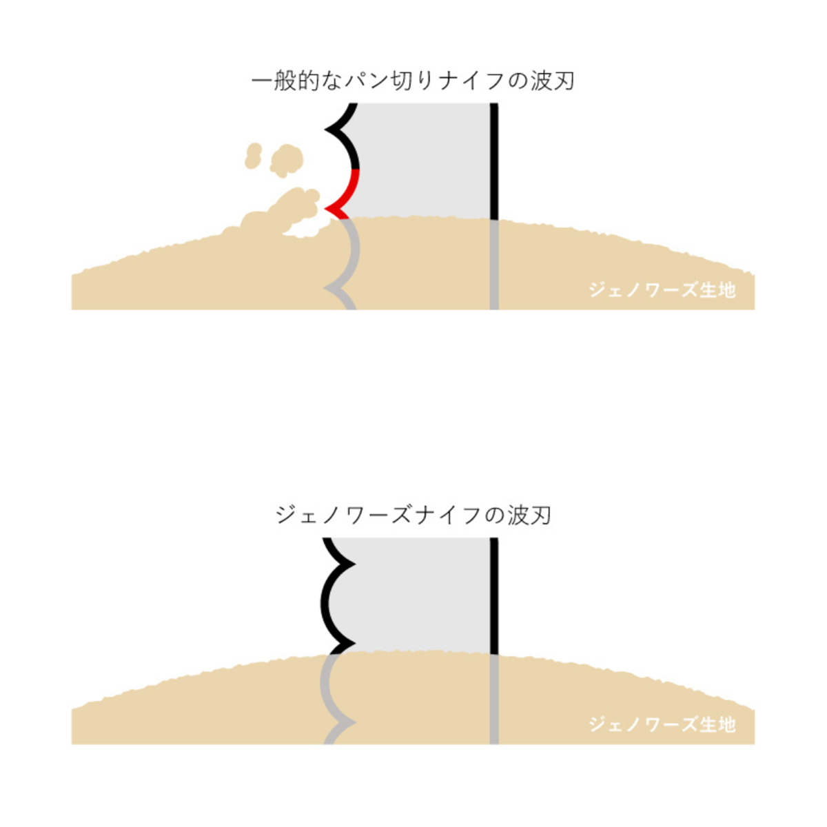 ケーキ生地を傷つけない波刃一般的なパン切りナイフは、鋭い形の波刃で力強く食材に切り込みますが、ジェノワーズナイフは抵抗が少なく柔らかなケーキ生地を傷つけないようにカットできます。