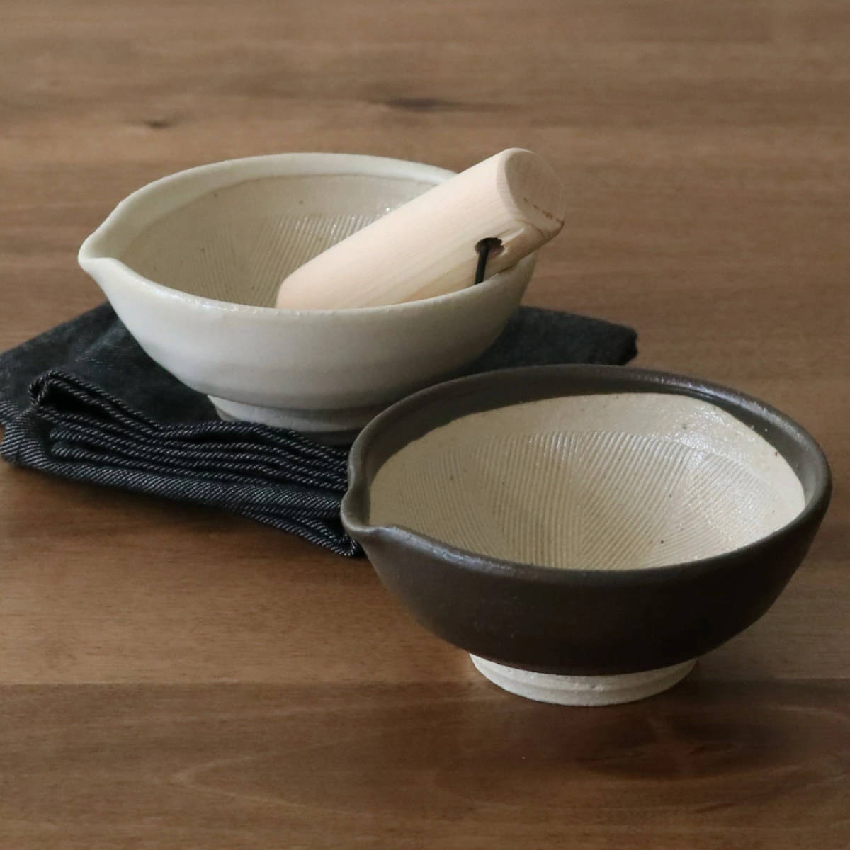 片口すり鉢は、12cm・16cm・19cm・丸10cmの4サイズございます。別売ですり鉢と相性の良いすりこぎがございます。片口すり鉢に合わせて、お好みのサイズをお選びください。