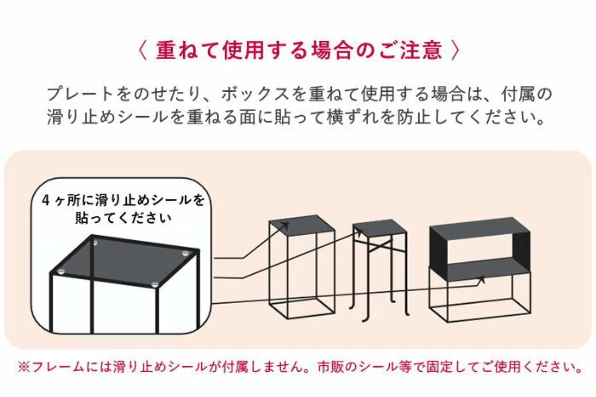 汎用性を高めるため、あえてストッパーなどの付属はありません。重ねて使用する場合は、市販のすべり止めシールや磁石、ワイヤーなどで固定してください。