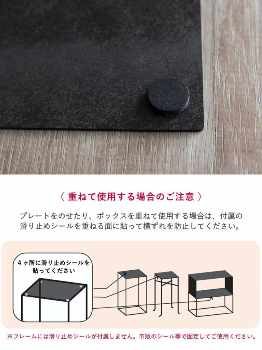 汎用性を高めるため、あえてストッパーなどの付属はありません。重ねて使用する場合は、市販のすべり止めシールや磁石、ワイヤーなどで固定してください。