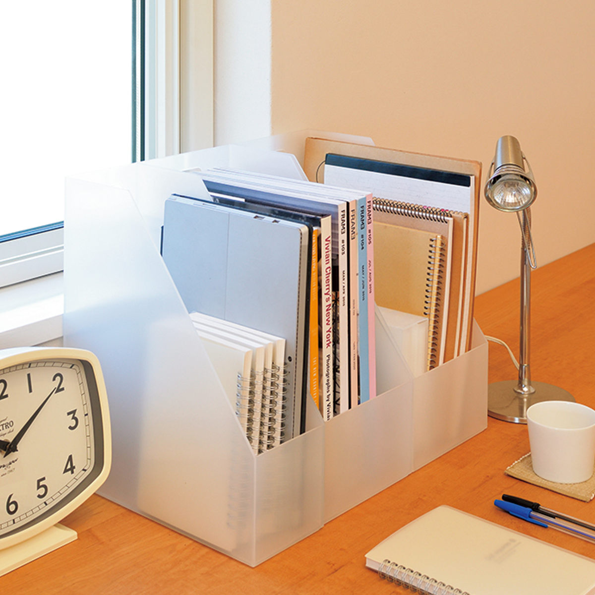 卓上収納 小物収納 ファイル ケース A4ファイル 書類 整理 仕分け クリアファイル 小物入れ おしゃれ オシャレ ステーショナリー オフィス 丈夫 頑丈 シンプル 机上 インテリア フライパン収納 キッチン収納 キッチン フライパン シンク下 システムキッチン 引き出し ランドリー キッチングッズ 白 透明 半透明 ホワイト クリア 色 シリーズ 組み合わせ フォルダ 事務用品 文具 文房具 書類整理 書類ケース 本棚 指穴 持ち手 LH19103