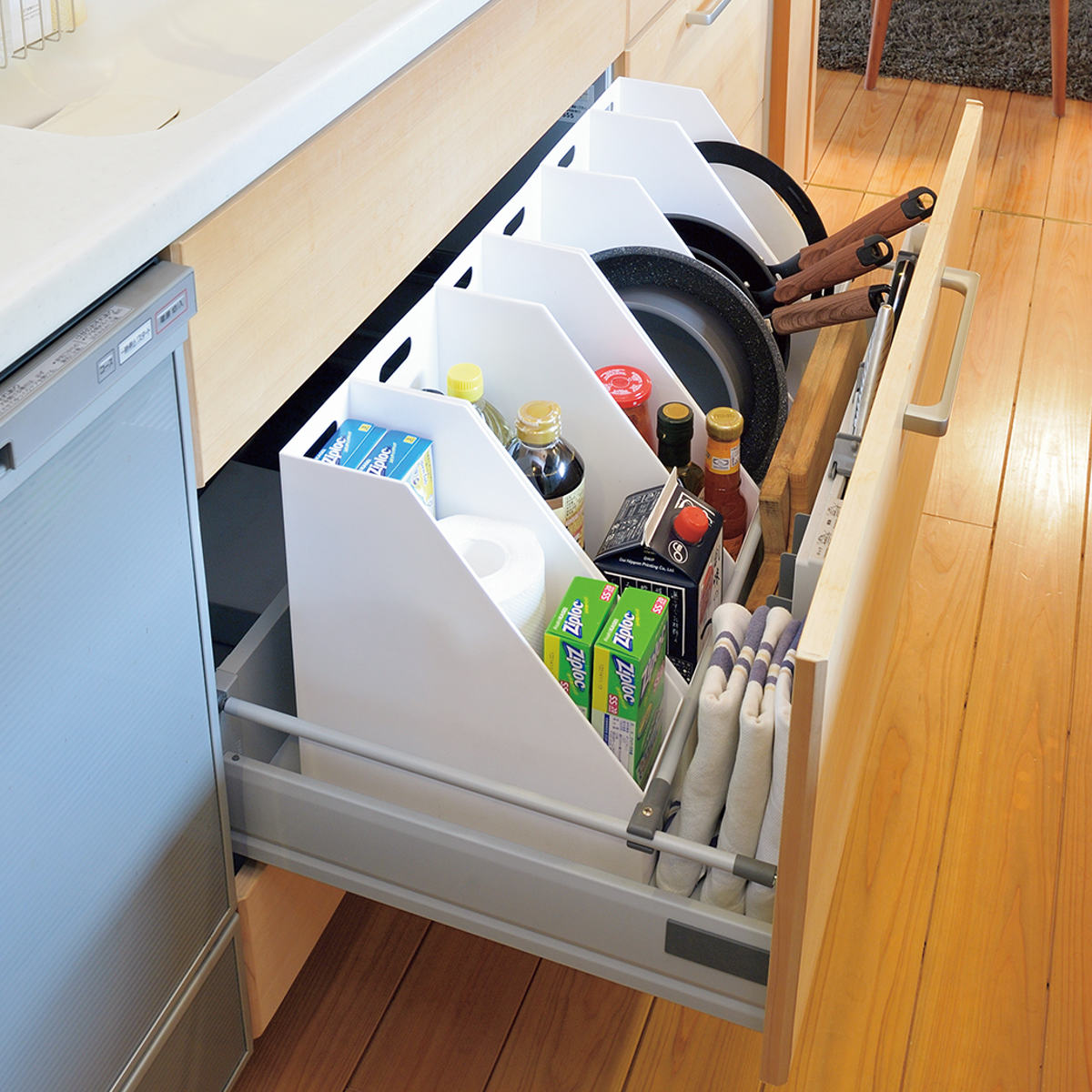 ●キッチン引き出し内のフライパンや調味料の整理にもおすすめです。