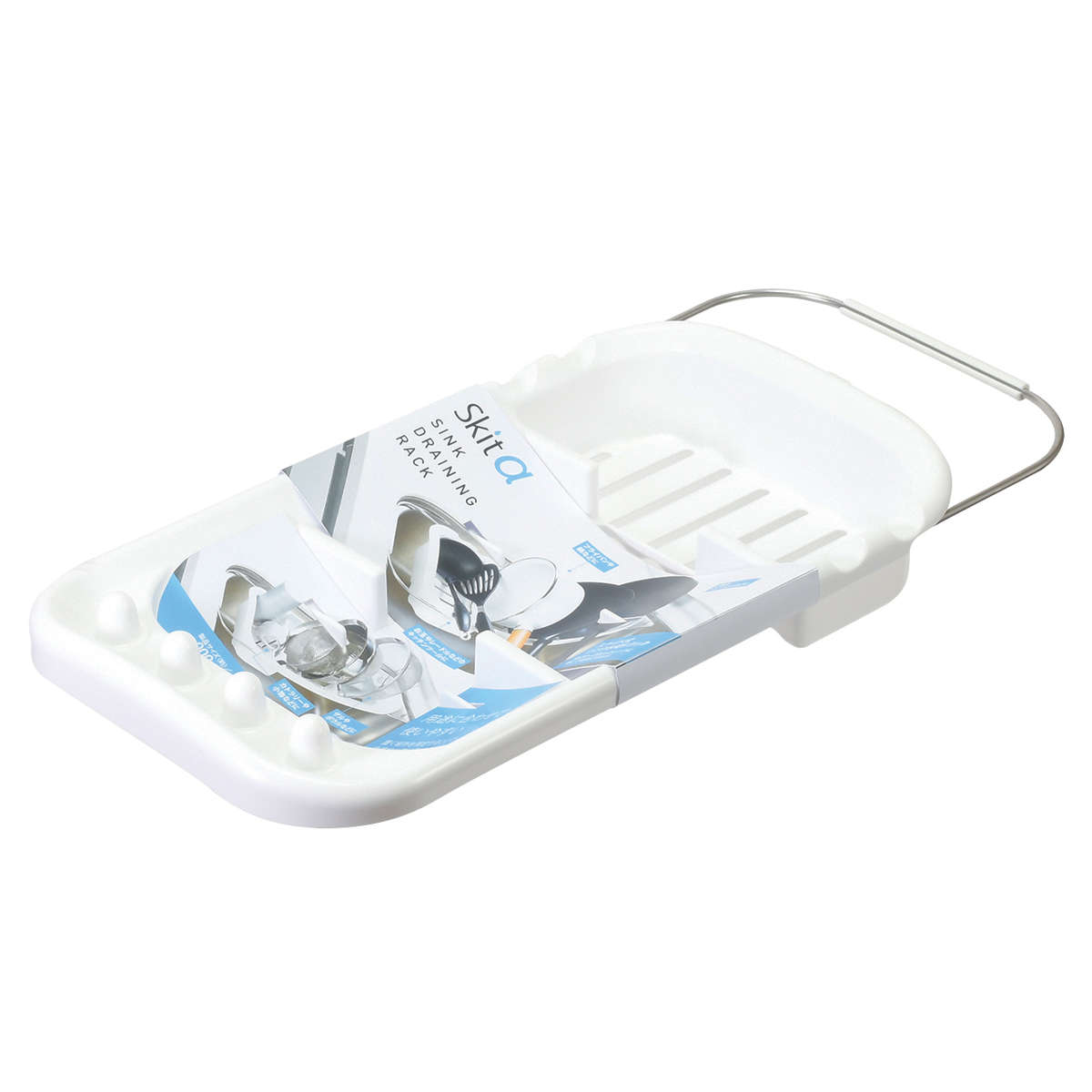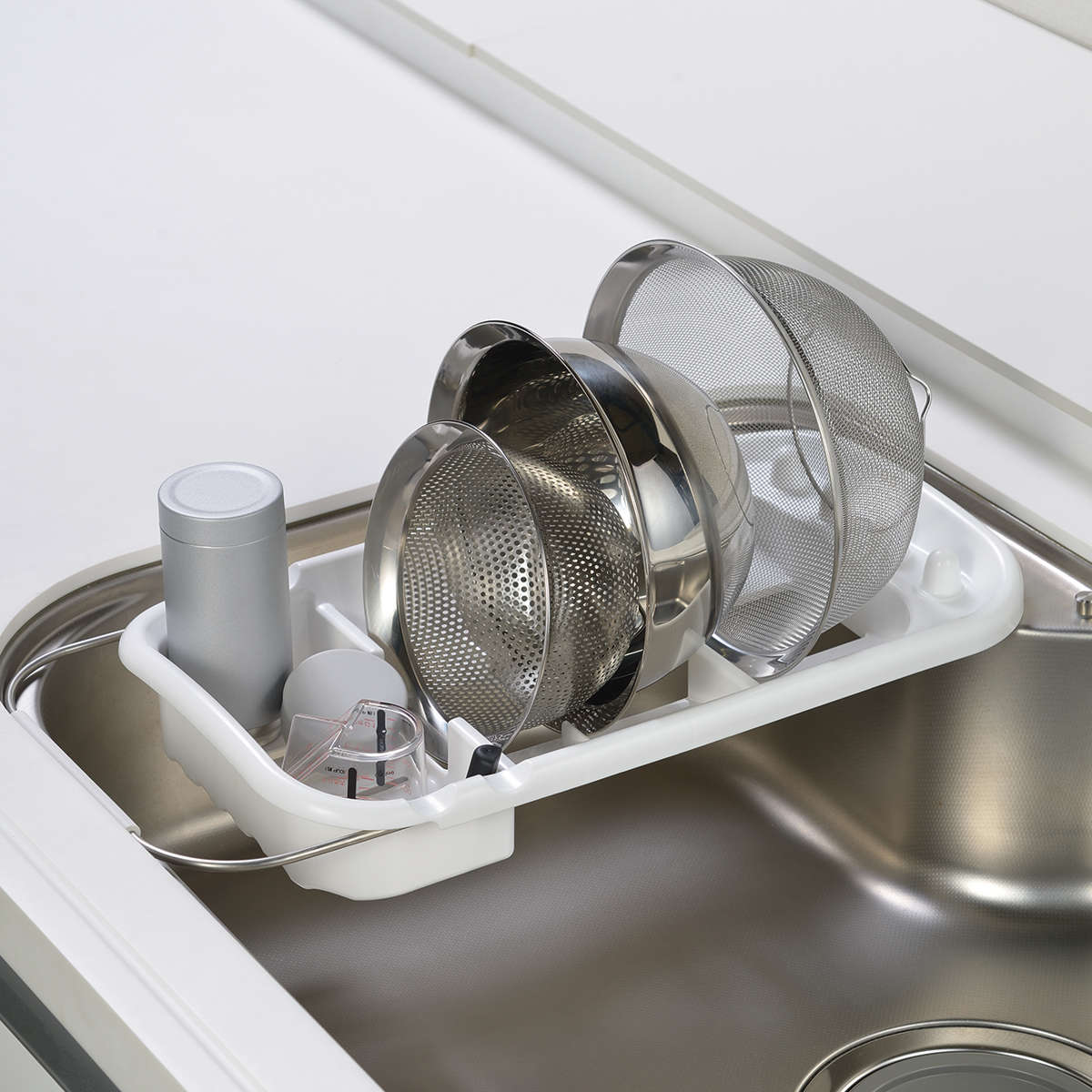 シンクに渡して使える伸縮式ラックシンクのサイズに合わせて伸縮でき、ぴったり設置できる水切りラックです。対応シンク幅は約39〜54cmで、スペースを有効活用できます。