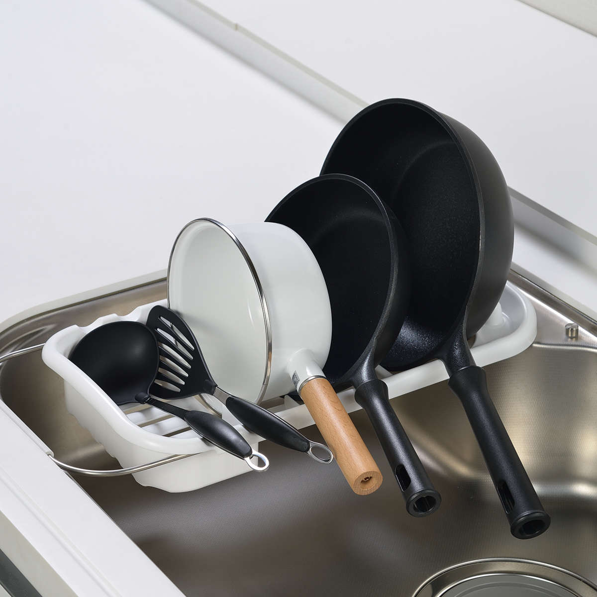 シンクに渡して使える伸縮式ラック●シンクに渡して使える伸縮式水切りラックです。