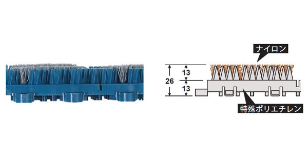 | 表面はフラット形状 凹凸が少なく、ヒールでも歩きやすくなっています。 | 丈夫なブラシ 硬いブラシ(ポリエチレン)とコシのある丈夫な細いブラシ(ナイロン)は耐久性も高く長持ちします。 |