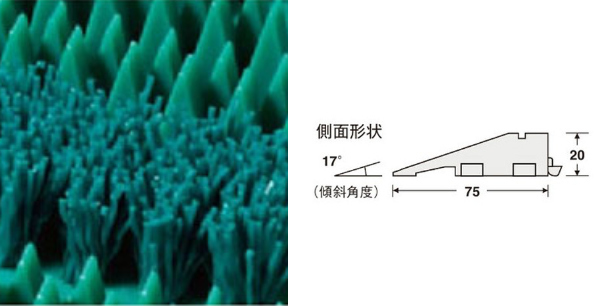 | 2種類のブラシ構造 靴裏に付着したどんな土砂も効果的に除去します。 | 段差を感じないゆるやかな傾斜 75mm幅でゆるやかな傾斜を付け、厚みを感じさせないマットです。ゆるやかな傾斜により、段差を感じずスムーズな通行が出来ます。 |