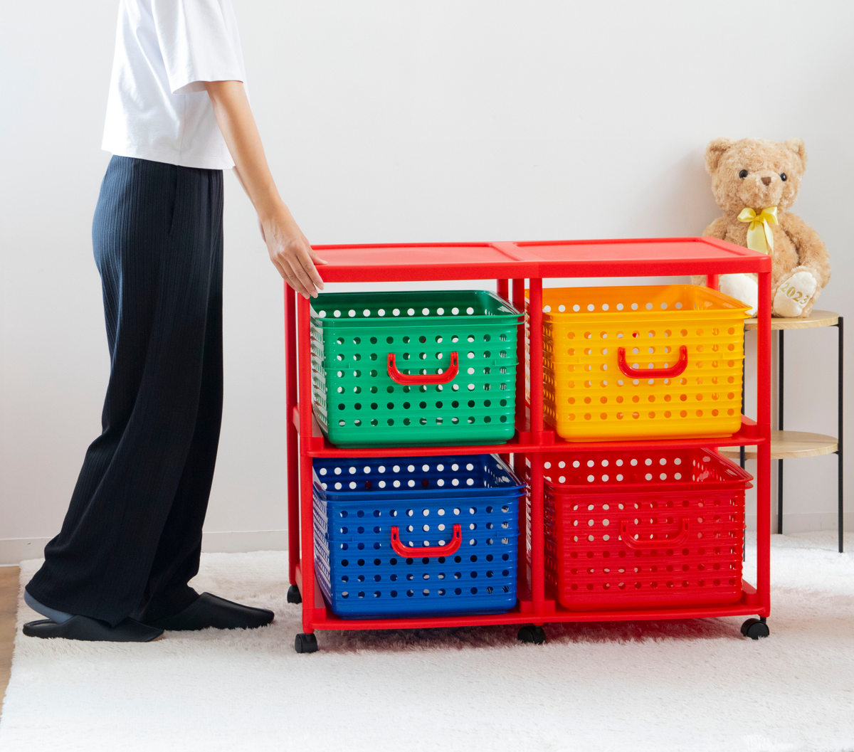 ●4色のカラフルなバスケットが、お子さまのお片付けの習慣付けを手助けします。