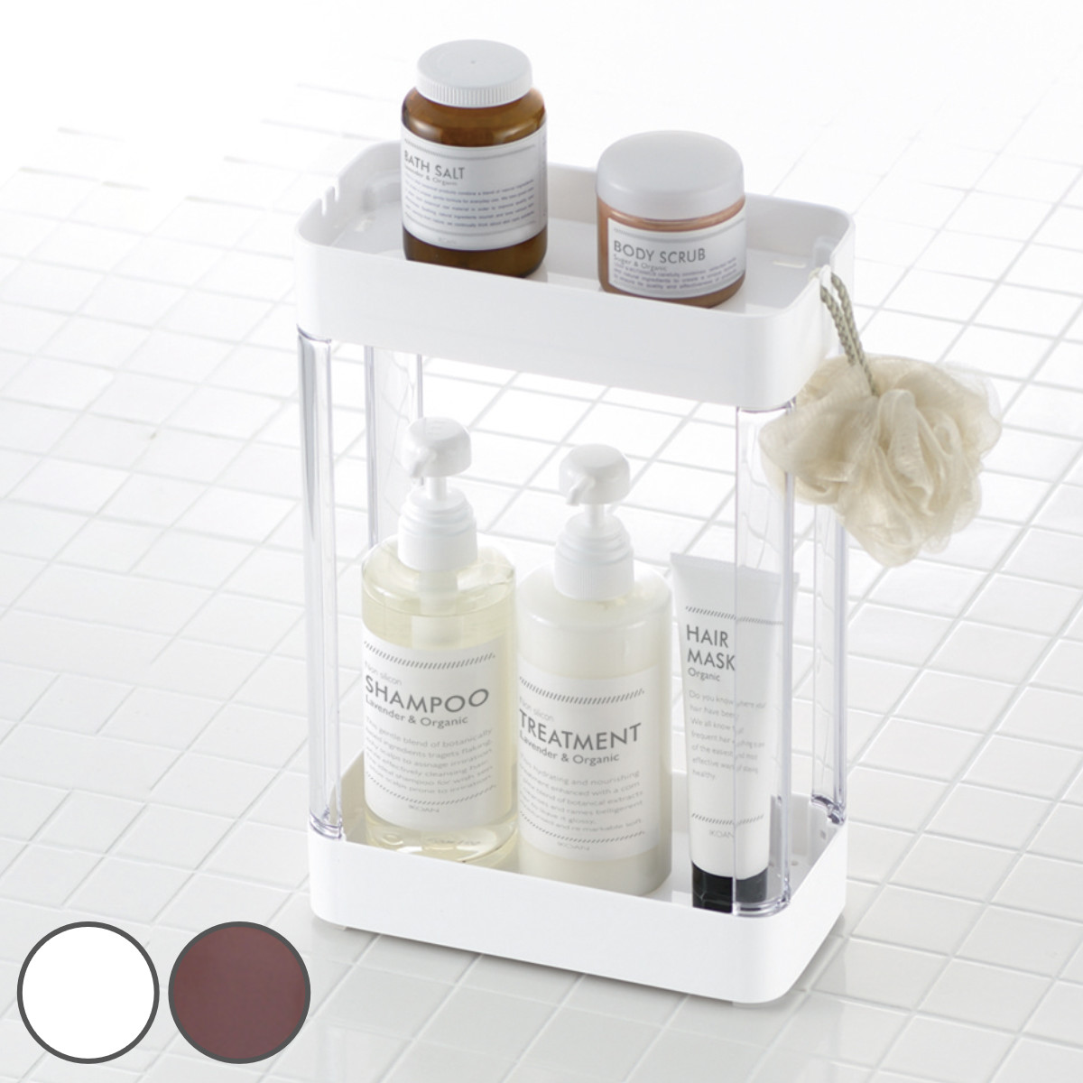 浴室小物をすっきり収納できるシャンプースタンド 2段浴室小物をすっきり収納できるシャンプースタンドです。清潔感のあるシンプルなデザインで、どんな浴室にも馴染みやすいです。大容量の2段構造なので、シャンプー、コンディショナー、ボディソープなどまとめて収納できます。
