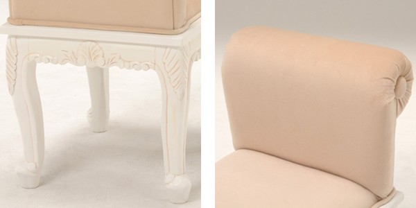 | エレガントな装飾と猫脚 細部惜しみなく施された浮彫りのデザインは、職人が一つ一つ丁寧に仕上げています。猫脚は先がコロンと丸く愛着のある形です。 | 級感のあるシート やわらかな印象のピンク色のシートは、光沢のあるスウェード調の生地です。クッションの硬さも程良く、心地よく体を包んでくれます。 |