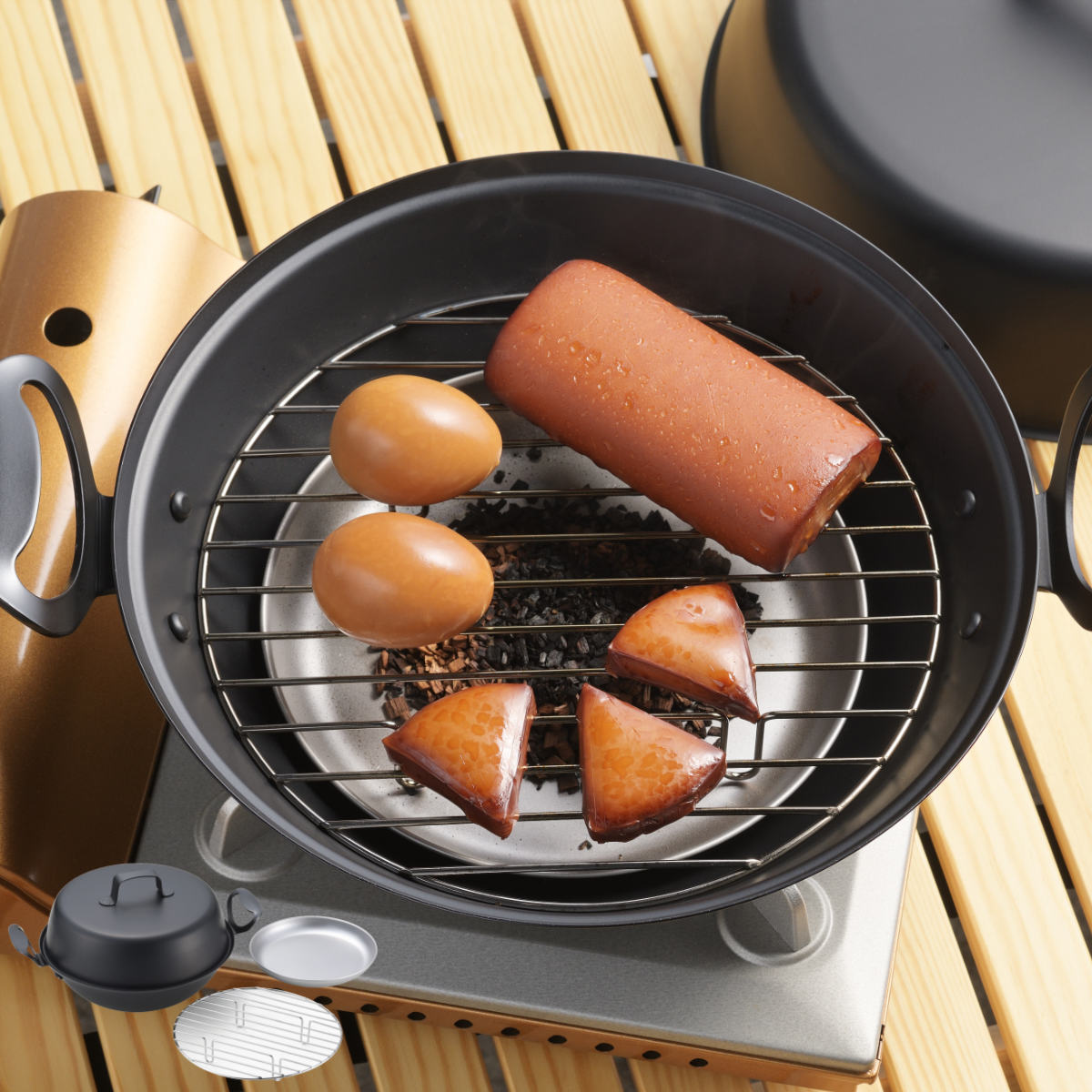 本格燻製を手軽に楽しむ、鉄製燻製器燻製が楽しめる鉄製の燻製器です。深さのある大きなフタで煙が全体にまんべんなく回りやすく、外へ漏れにくい仕様です。アウトドアで本格的な燻製料理をお楽しみいただけます。
