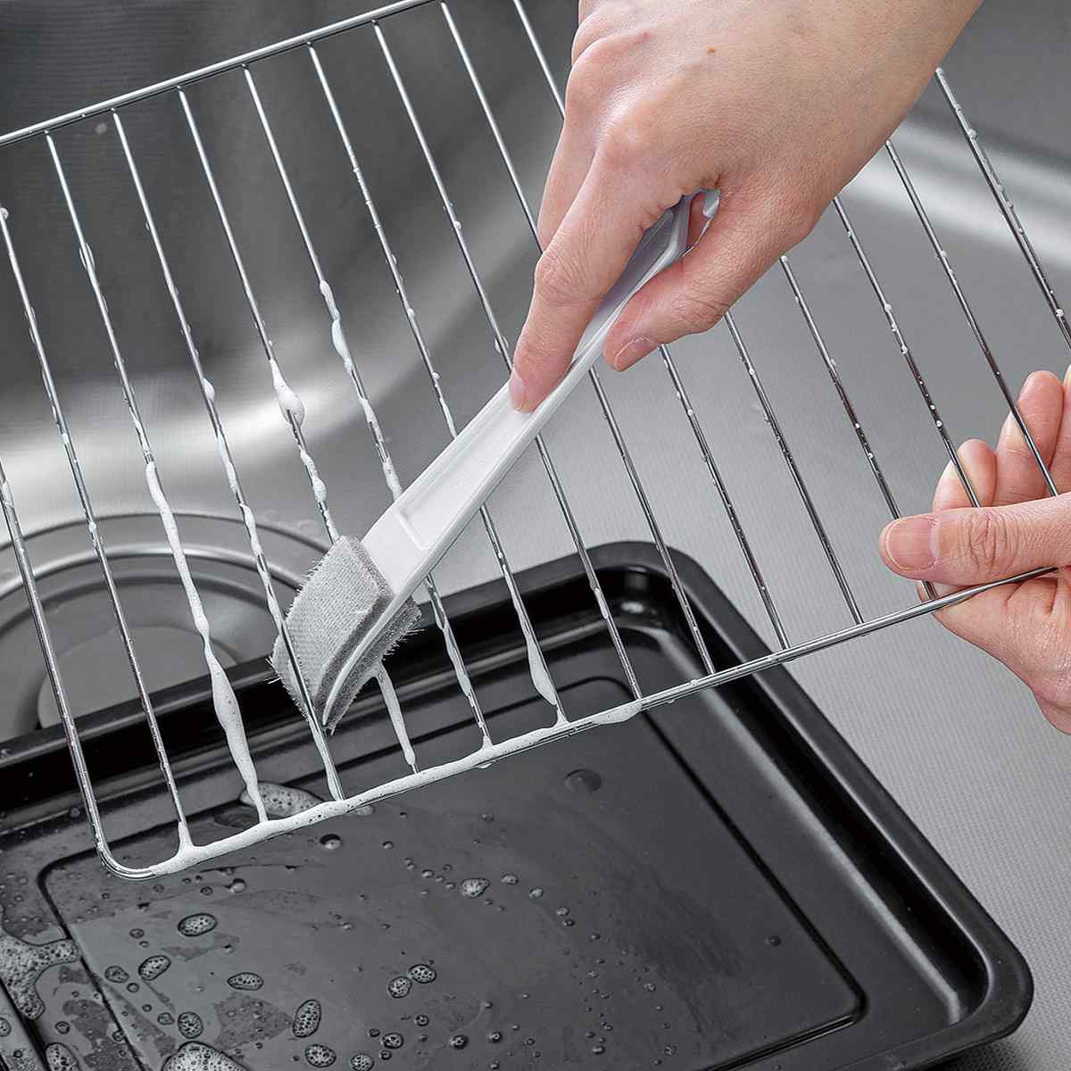 油汚れ・コゲ落とし用洗剤と併用することで、頑固な汚れをしっかり落とせるお掃除ブラシです。洗剤が汚れに浸透して浮かせた後、ブラシがその汚れをかき出し、しっかりとはがし落とします。