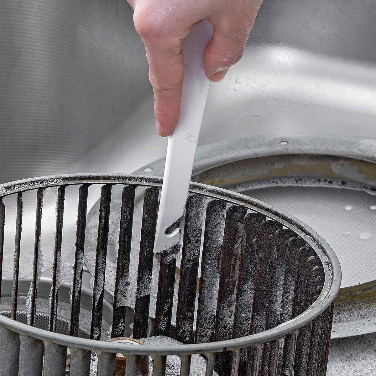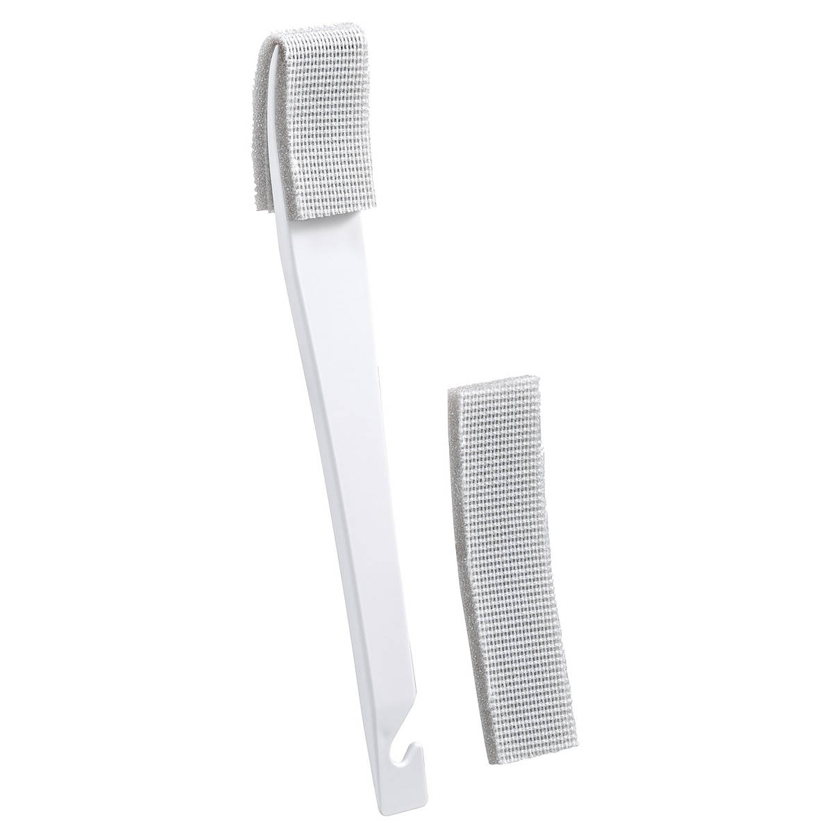 ハンドル持ち手側はヘラとして使うこともできます。換気扇のこびりついた頑固な汚れを、しっかりとかき出すのに便利です。また、ふきんや薄手のお掃除シートなどを巻きつければ、こすり洗いにも活用でき、細かい部分の清掃にも最適です。