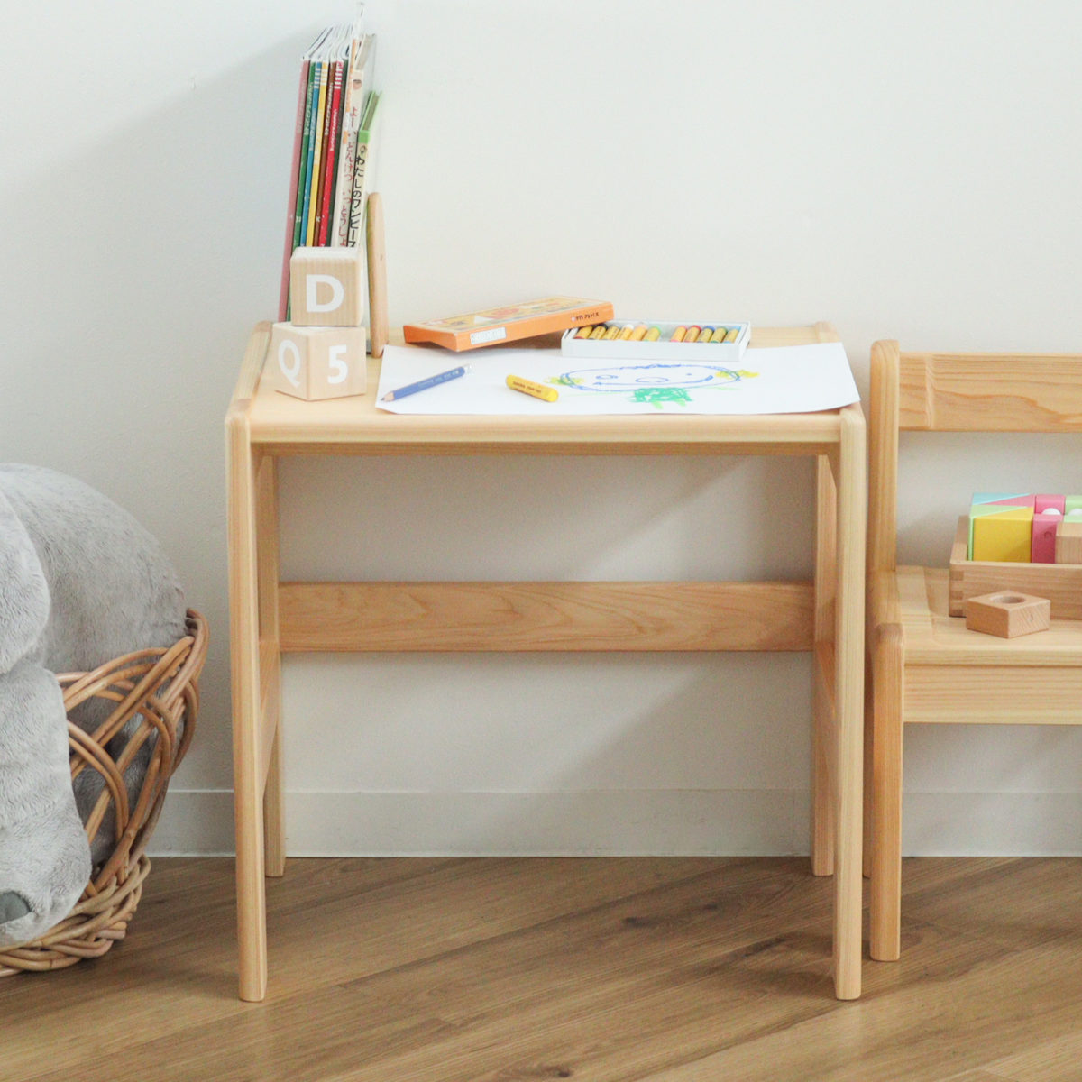 ヒノキの温かみを感じる、柔らかなフォルムが可愛らしいキッズデスクです。明るい色味の木材はインテリアになじみやすく、ナチュラルテイストのお部屋づくりにもぴったりです。