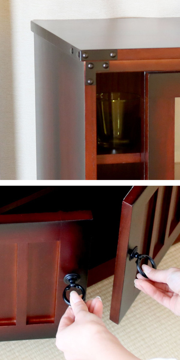 引戸収納が1箇所、開き扉収納が1箇所付いており、茶道具や小物、食器などの収納に便利です。上下の収納に取り外し可能な棚が1枚ずつ付いています。