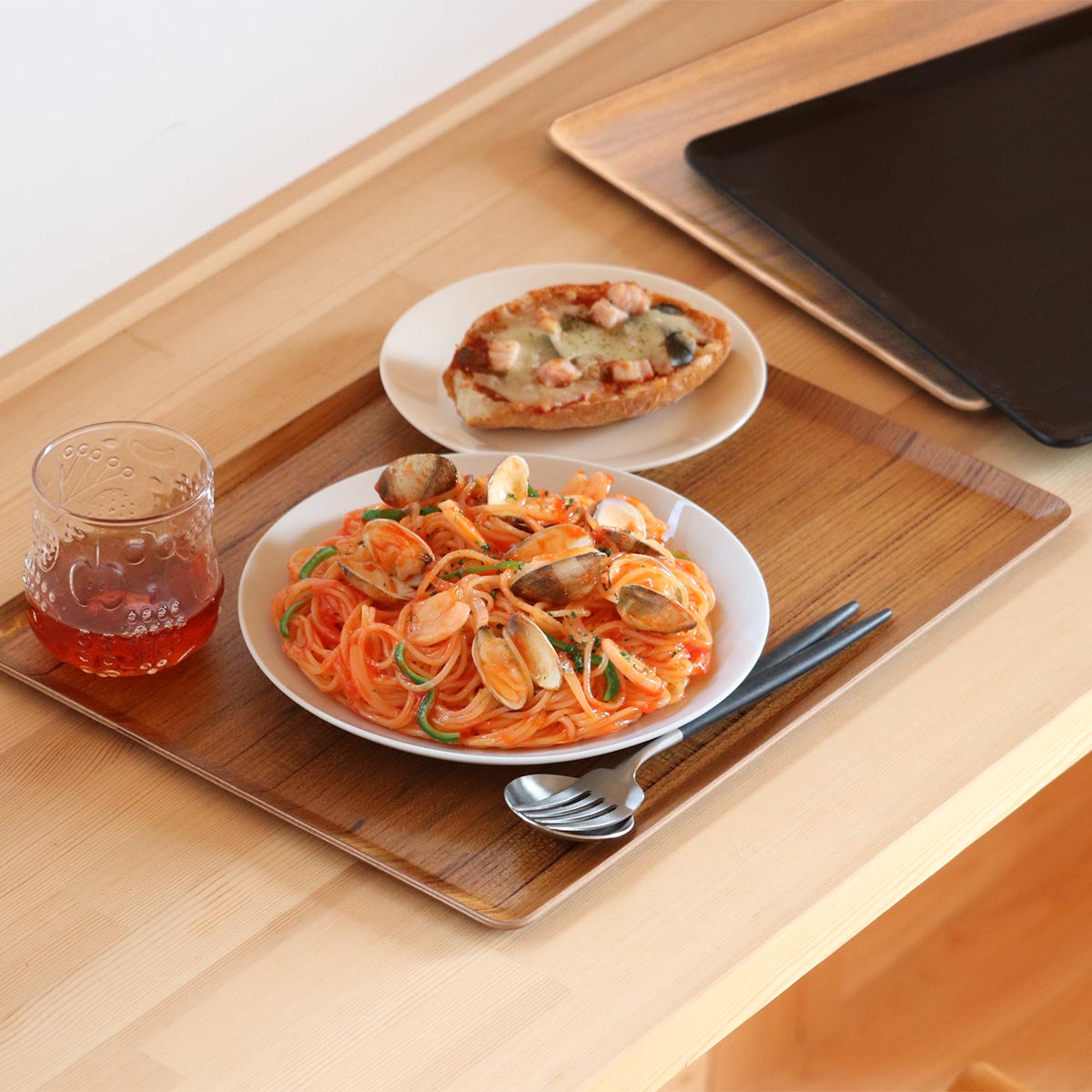 ランチタイムや来客時にも プレイスマット 36×28cmメインのお皿とドリンクが置けるサイズです。来客時のティーセットを運ぶのにも十分な大きさです。優しい木目調のトレーなので、洋食器にも和食器にも馴染みます。
