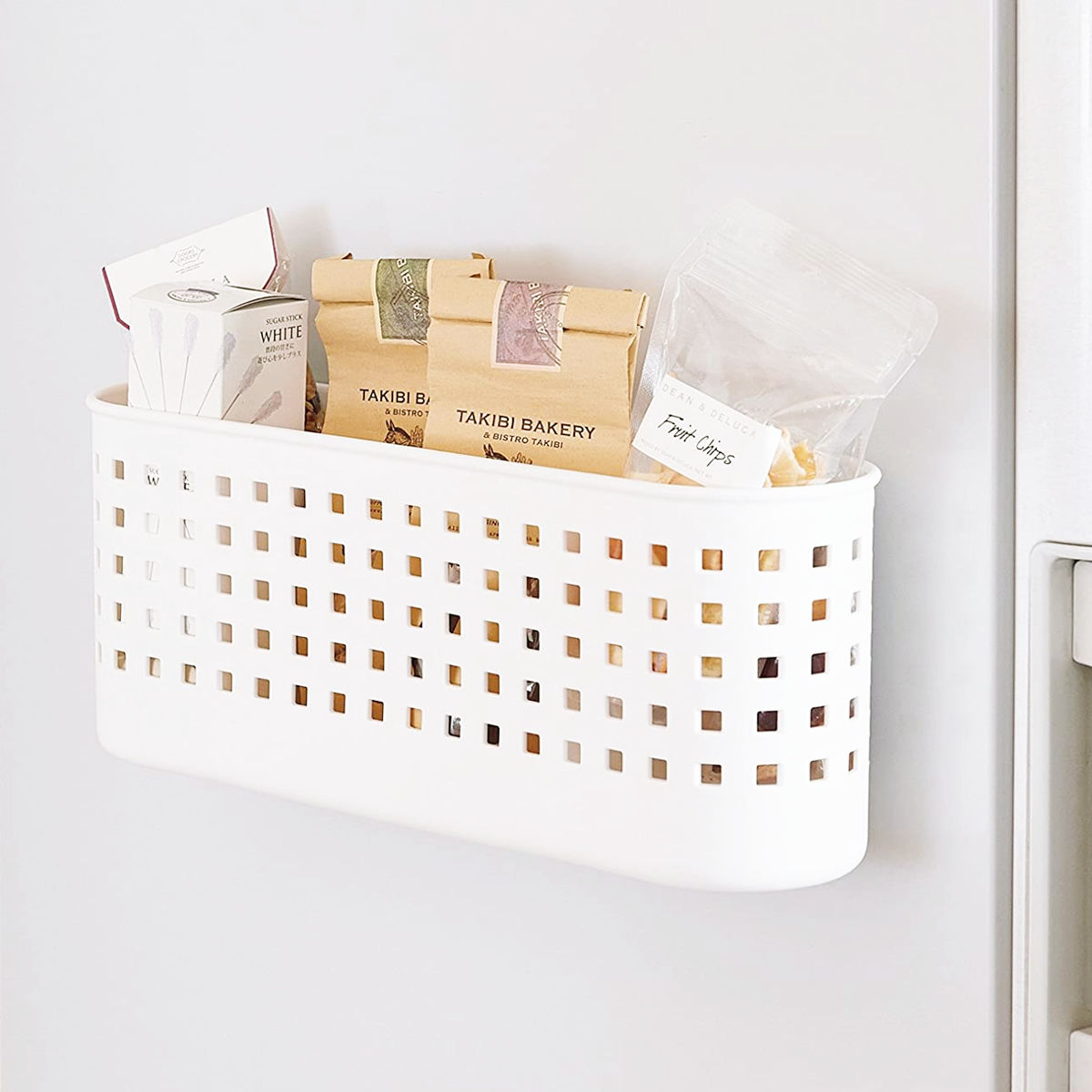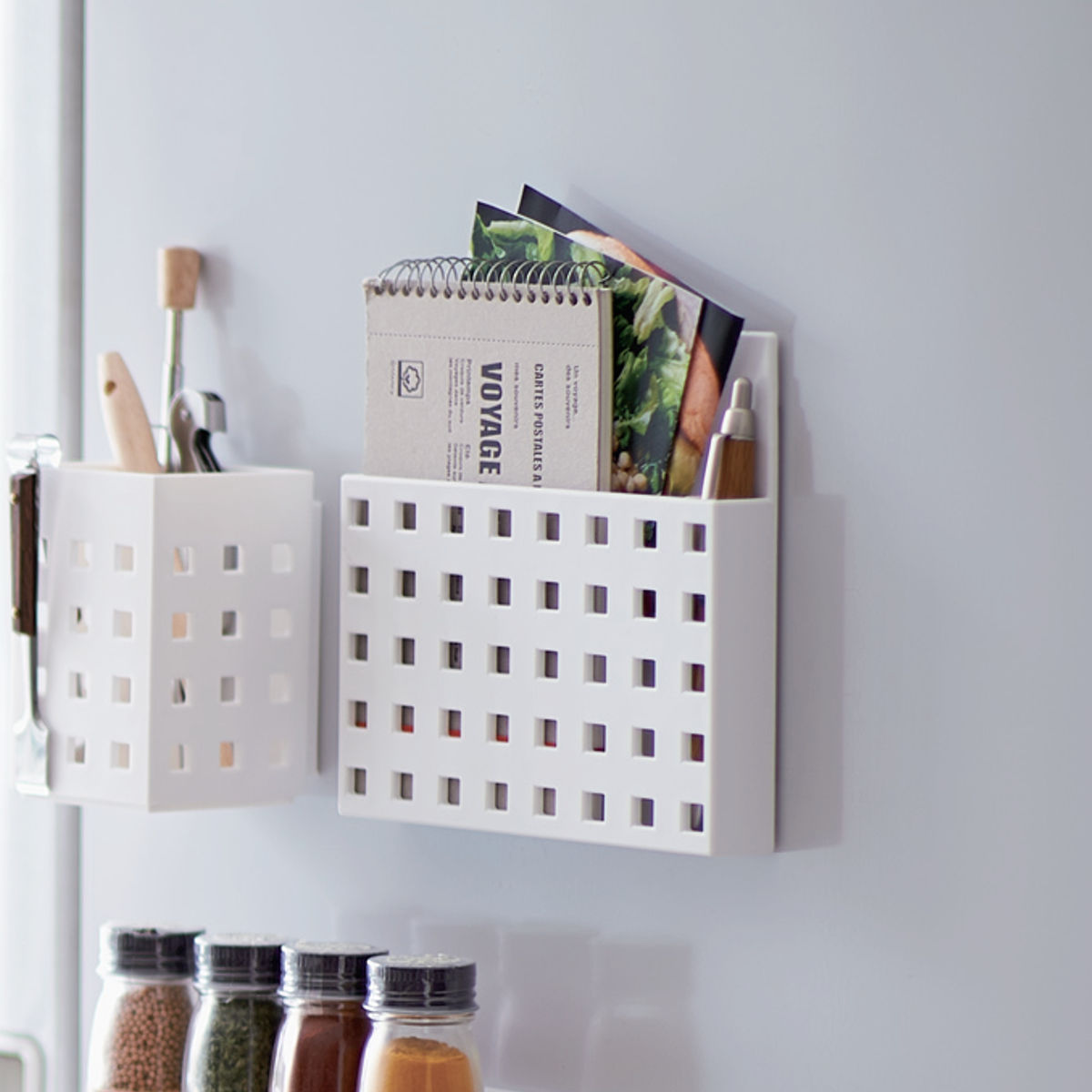 冷蔵庫サイドの空きスペースを有効活用散らかりがちな小物をまとめてたっぷり収納できるワイドサイズのバスケットです。すぐ使いたいけど置き場所に困っていた物も、サッと使うことができるのでお料理もはかどります。2枚の仕切りが付いているので、収納した物が倒れたりすることがなく安定感があります。また、マグネットでの取り付けなので、ちょっとした収納スペースを作ることができて便利です。