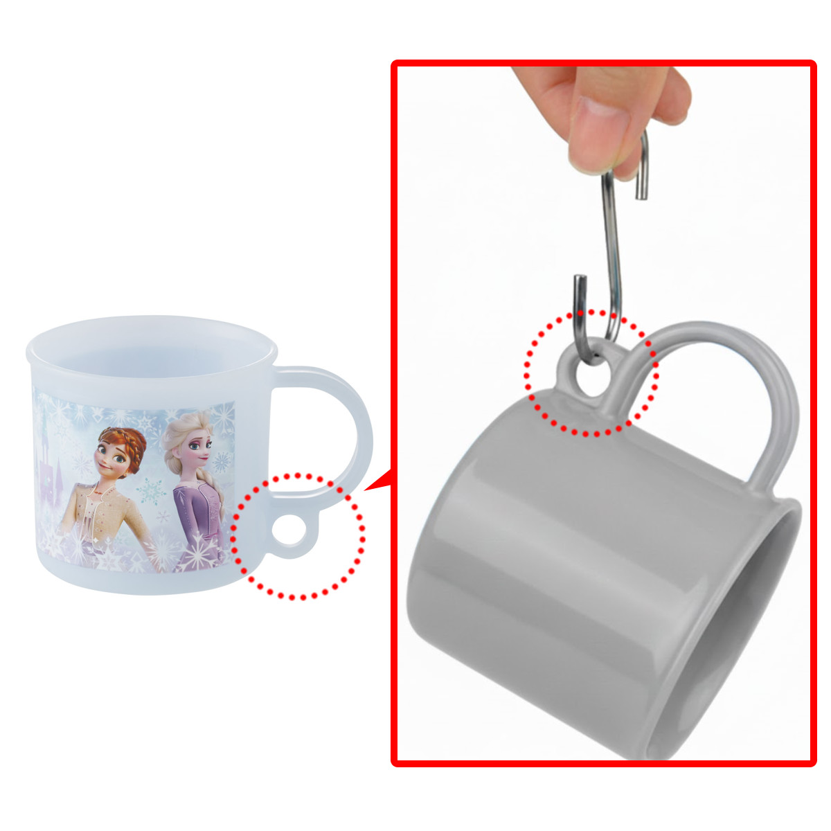 逆さに吊れる清潔設計コップの持ち手の下にフックなどに掛けられる部分が付いているので、使用後や洗った後などに逆さにして吊っておけば、水切れが良くとても衛生的です。