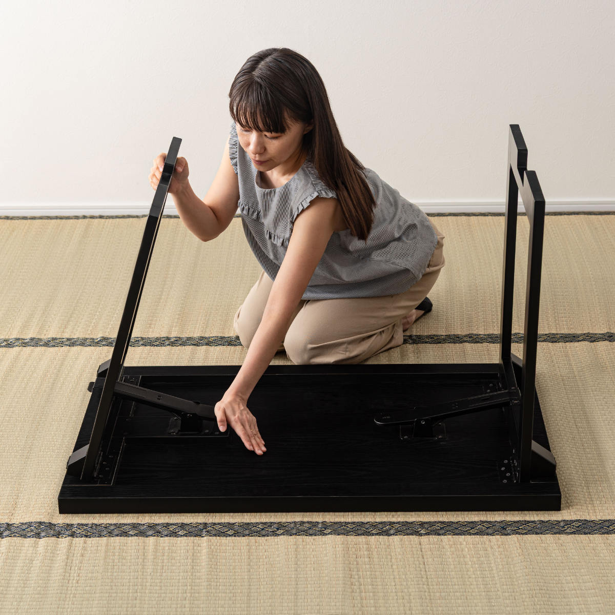 2WAYで使える折りたたみ式脚を立てればハイテーブルとして、折りたたんだ状態ではローテーブルとしてお使いいただけます。ひっくり返して金具を押しながら脚を倒すだけの簡単操作で、気軽に畳めます。使わない時にも省スペースで収納が可能です。