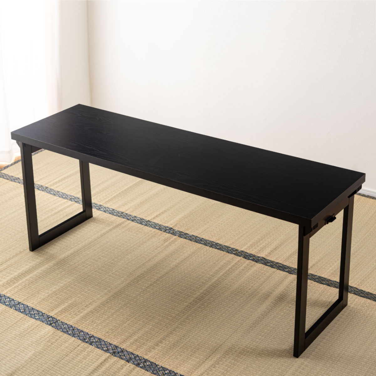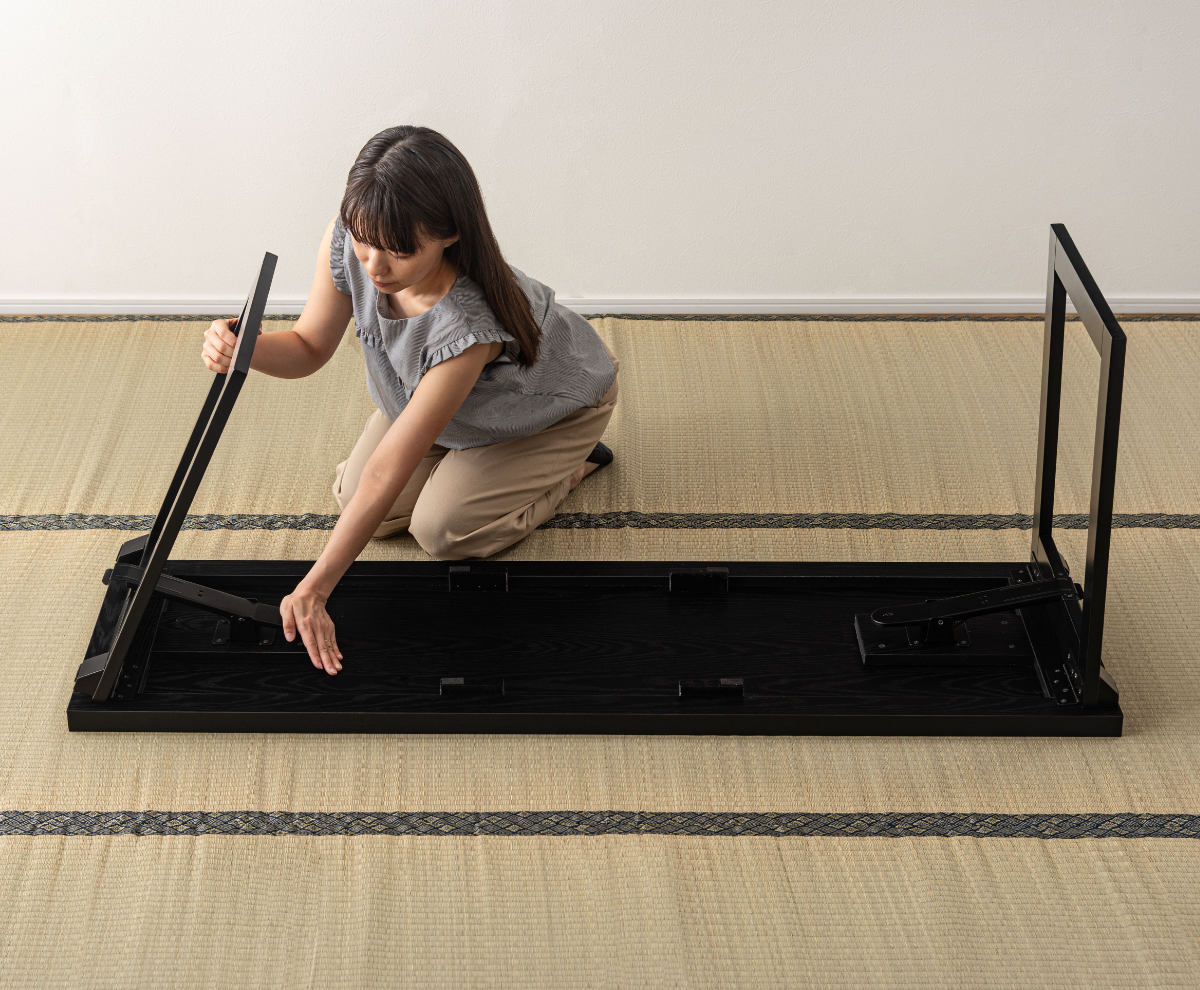 2WAYで使える折りたたみ式脚を立てればハイテーブルとして、折りたたんだ状態ではローテーブルとしてお使いいただけます。ひっくり返して金具を押しながら脚を倒すだけの簡単操作で、気軽に畳めます。使わない時にも省スペースで収納が可能です。