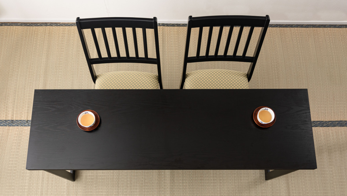 和室に映える上品でモダンなデザインぼんやりと浮き出る木目調が、格調高い趣のある雰囲気を演出するお座敷テーブルです。料理店や法事など幅広くご利用いただけます。