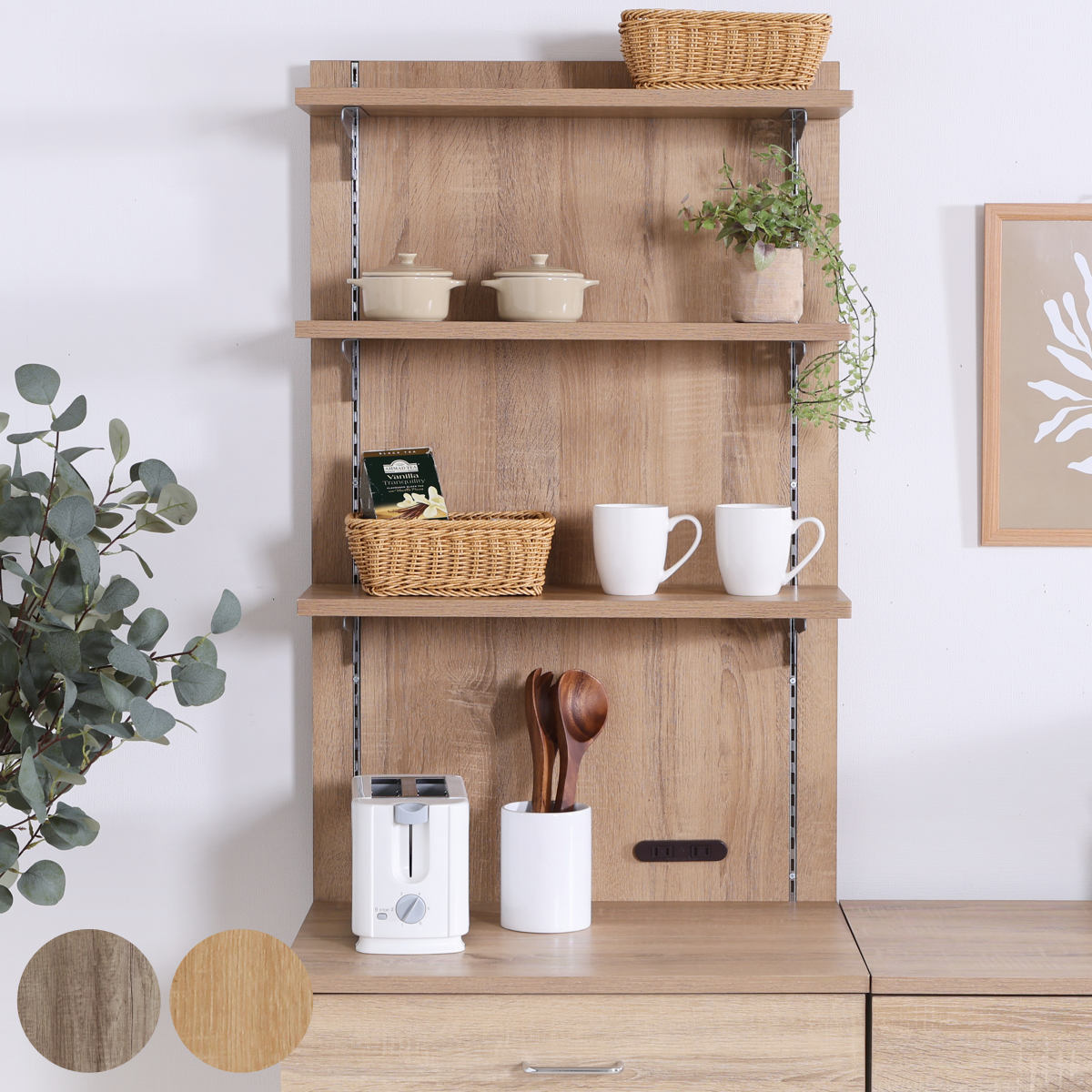 別売りのキッチンボードに取り付けて、収納スペースを手軽に拡張できるバックボードです。上に収納を拡げられ、食器や調味料をたっぷり収納できる3段です。