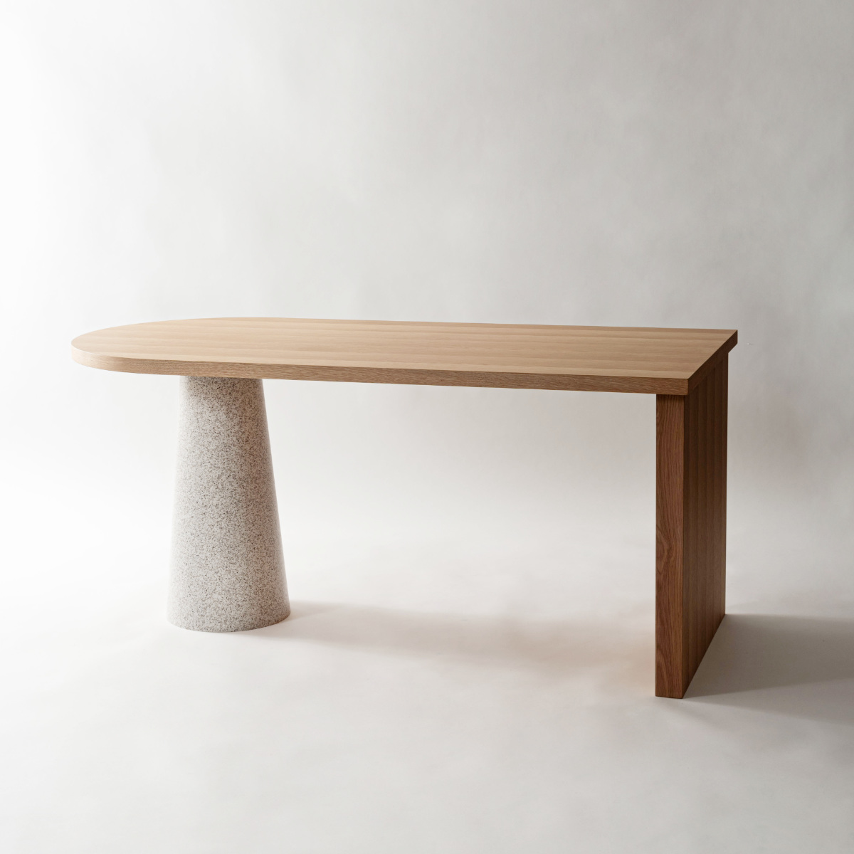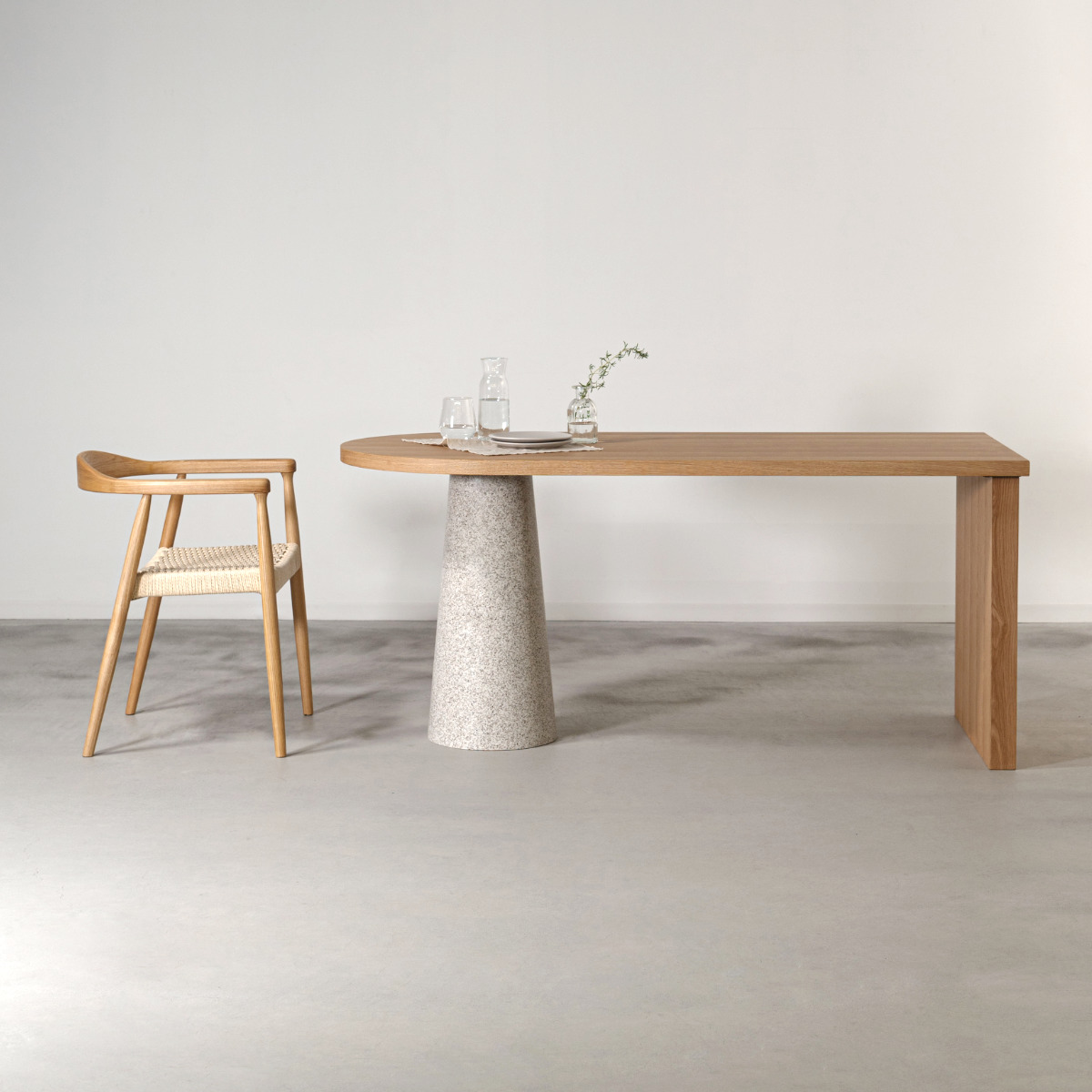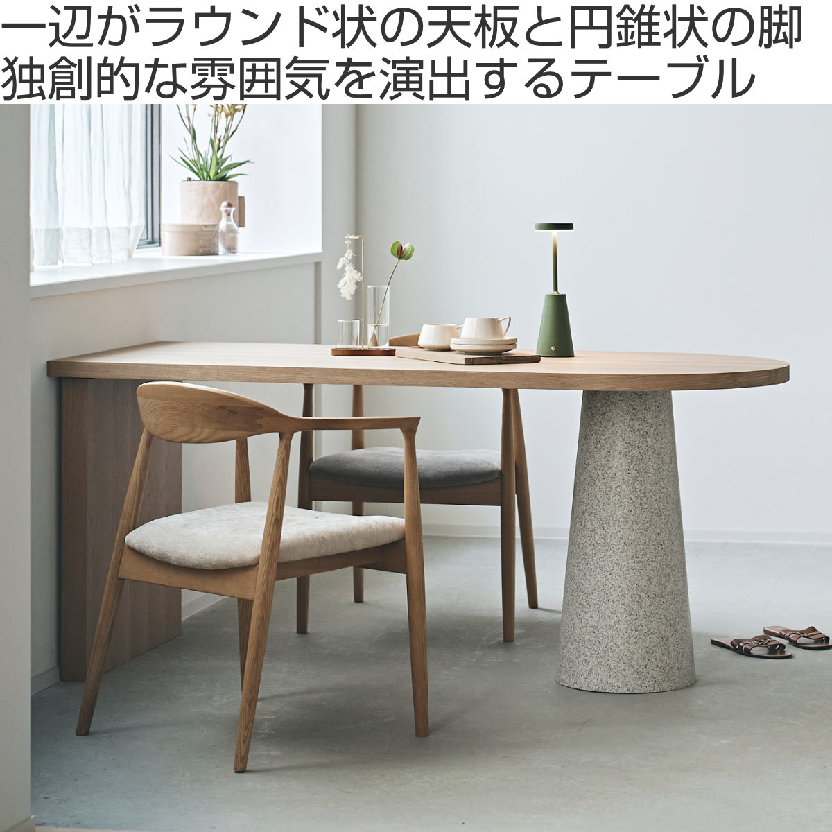 一辺がラウンド状の天板と円錐状の脚が組み合わさり、独創的な雰囲気を演出するダイニングテーブル。置くだけで空間の主役になり、ダイニングを印象的で洗練された空間に仕上げます。