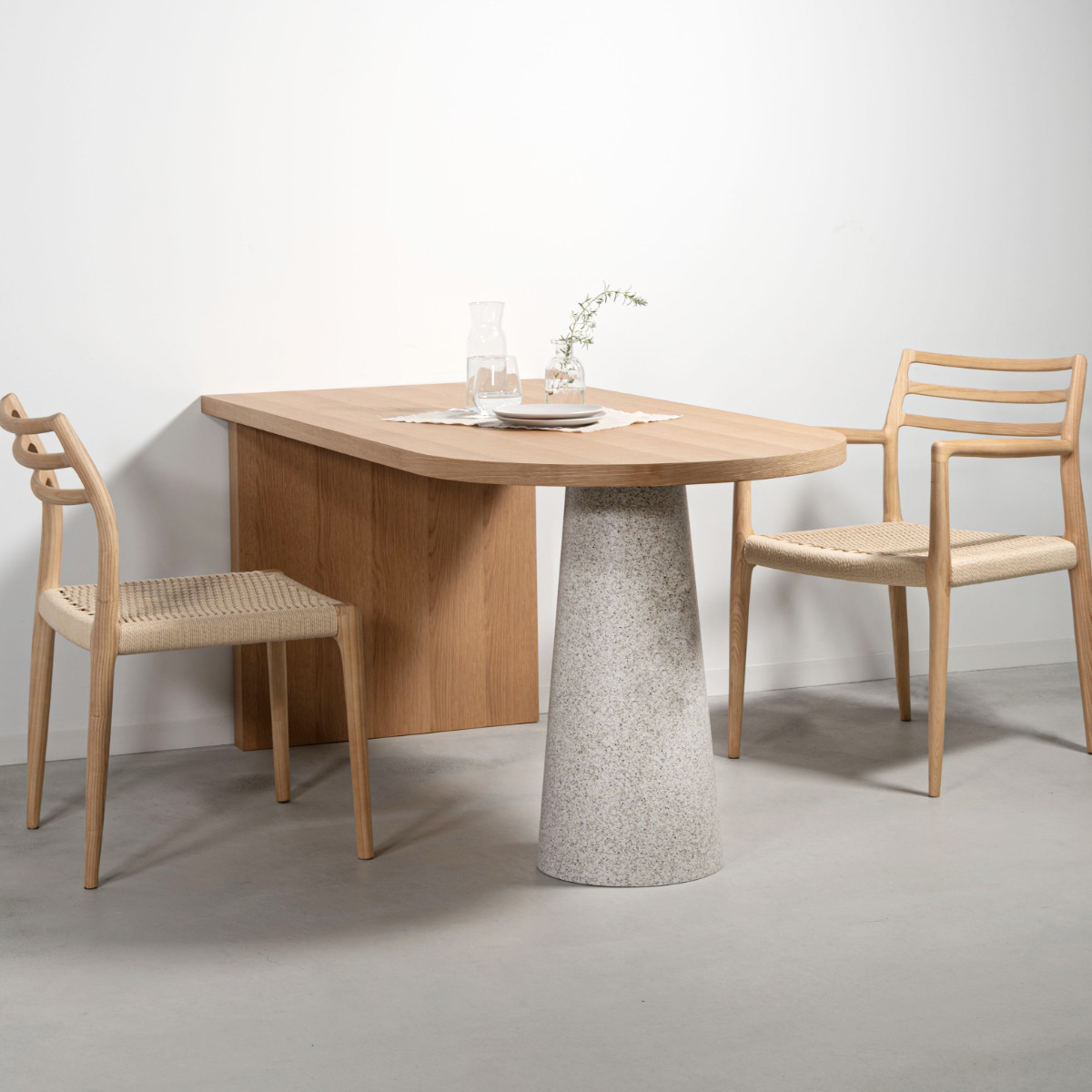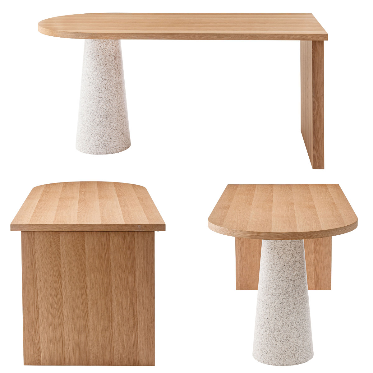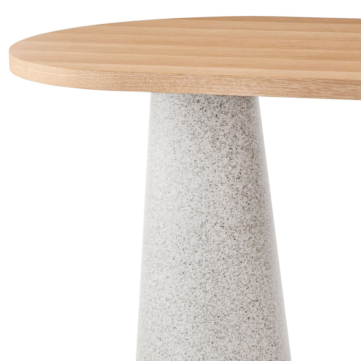 一辺がラウンド状の天板と円錐状の脚が組み合わさり、独創的な雰囲気を演出するダイニングテーブル。置くだけで空間の主役になり、ダイニングを印象的で洗練された空間に仕上げます。