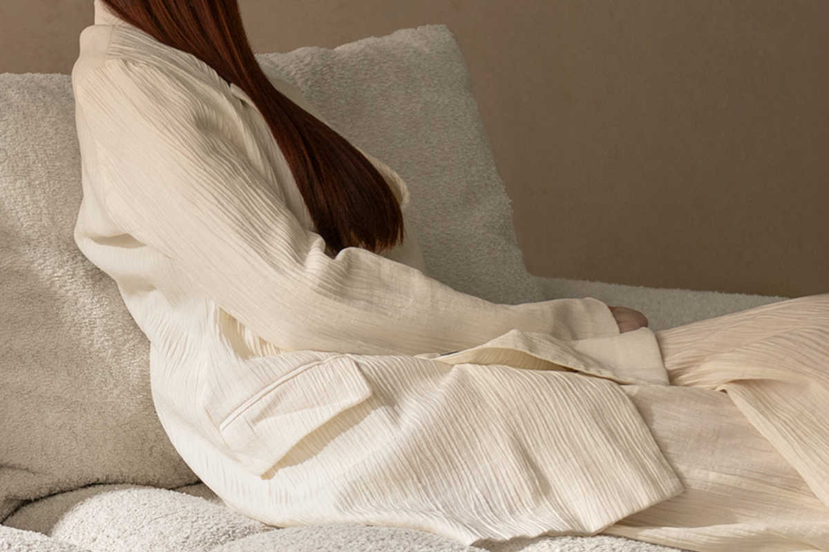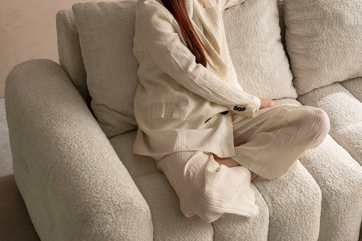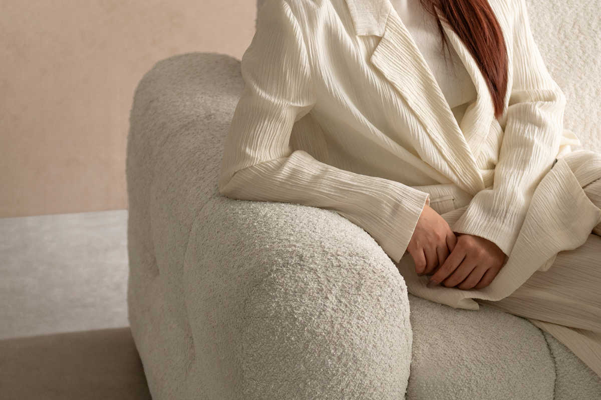 表情豊かなブークレ生地を使用。もこもことした立体感のある質感と、柔らかな触り心地が魅力で、見た目にもあたたかみのある印象を与えます。