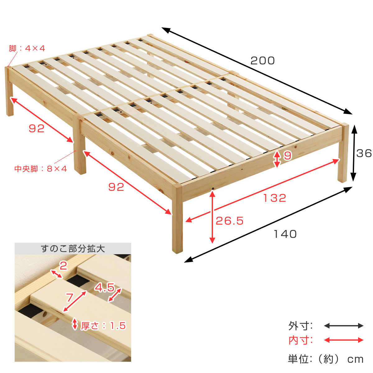 | 材質 | フレーム・脚部:天然木パイン(ラッカー塗装) すのこ:LVL積層合板 |