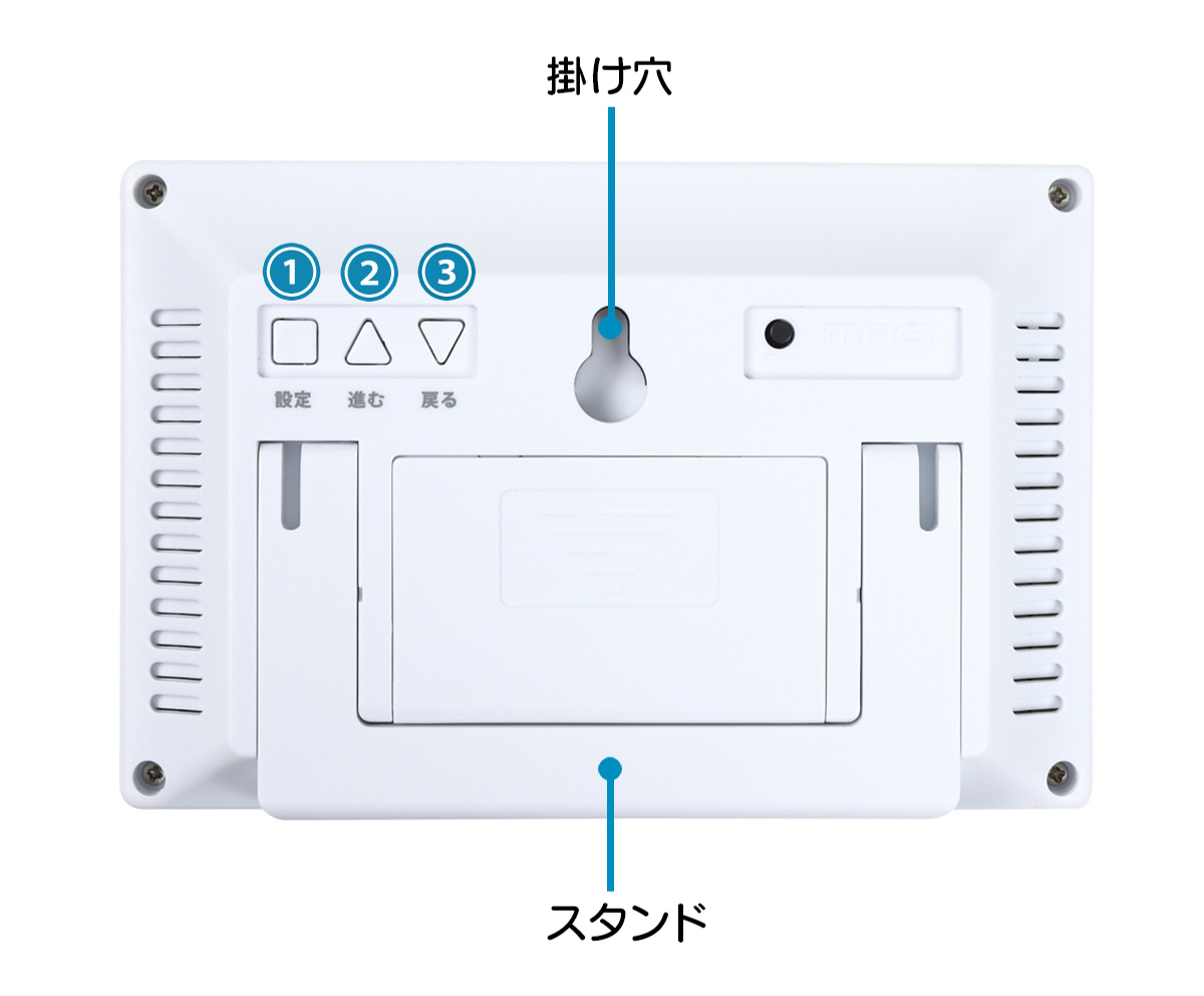 時計の背面には掛け穴とスタンドが付いているので、掛け時計としても置き時計としても便利にお使いいただけます。