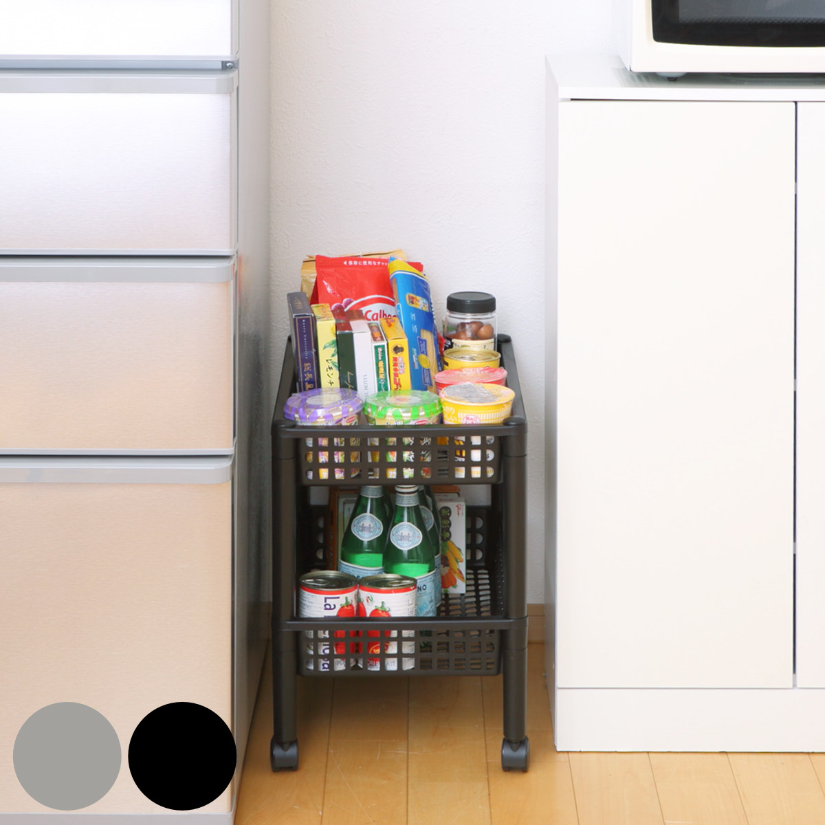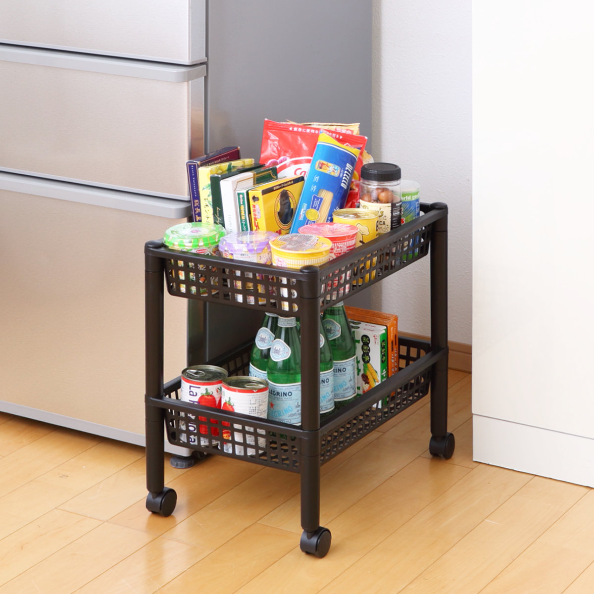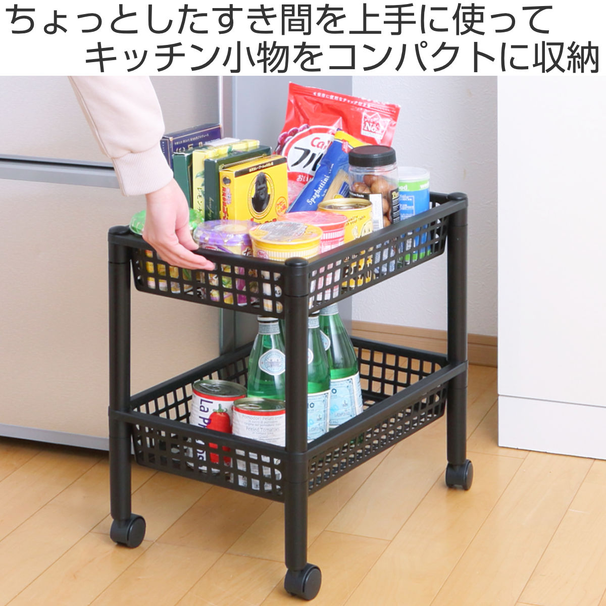調味料や乾物のストックにちょうど良いオープンタイプのキッチンワゴンです。スリム設計なので、冷蔵庫横やちょっとしたすき間を収納として有効活用できます。