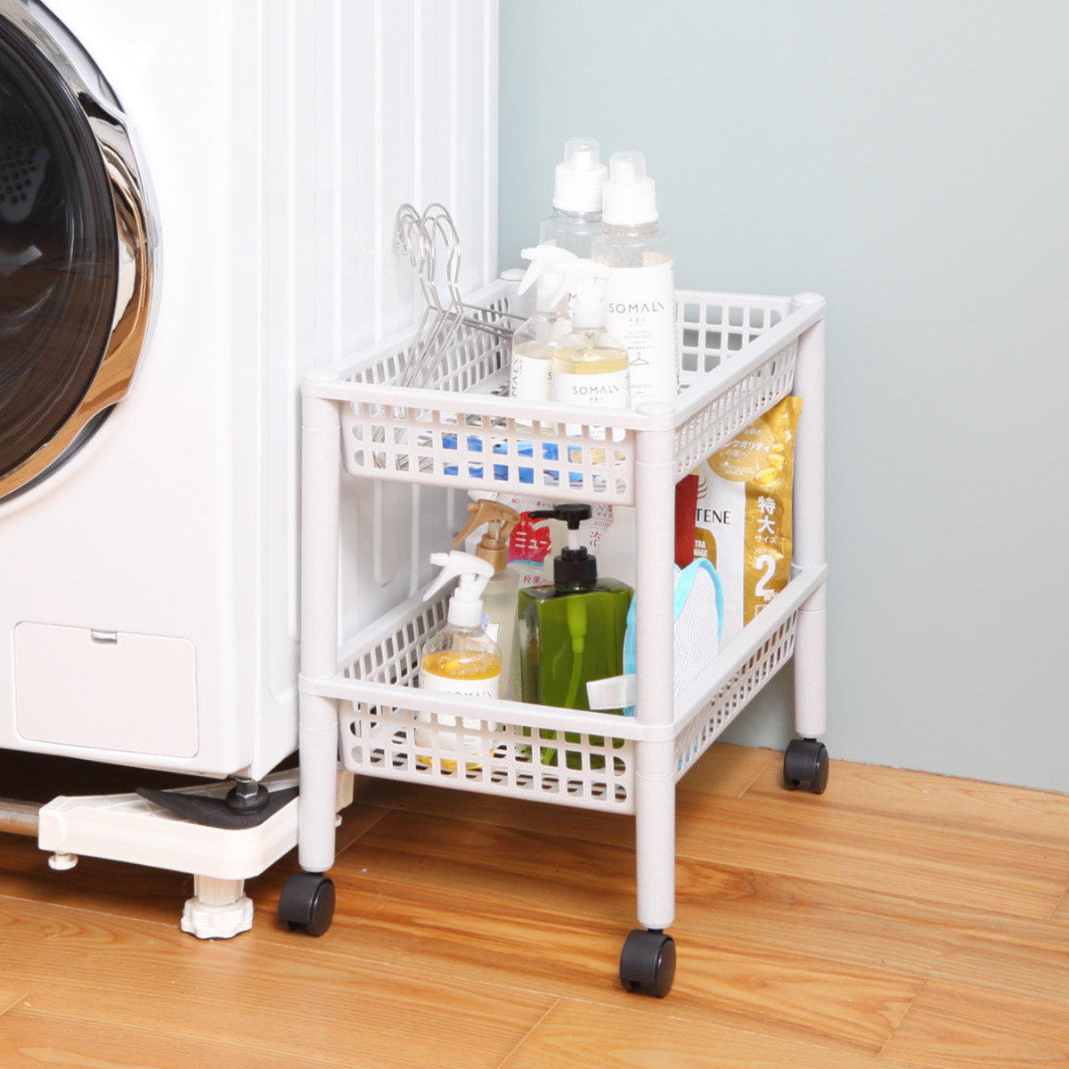 洗濯機横に置けば洗剤のストック収納やタオルなどの収納にピッタリ。すぐ手に取れる場所にスッキリとまとめて収納しておけます。