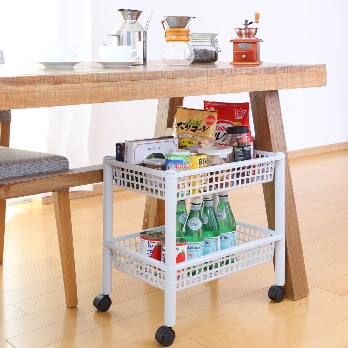 背が低めのワゴンなので、ダイニングテーブルの下にすっきり収納できます。テーブル上で散らかりがちな小物や、カトラリー・ティーセットなどを整理しておけば、使うときも片付けるときもスムーズです。
