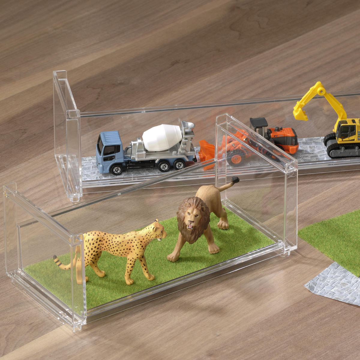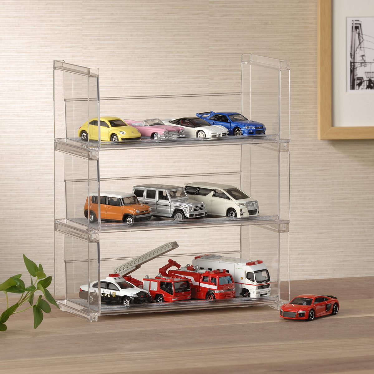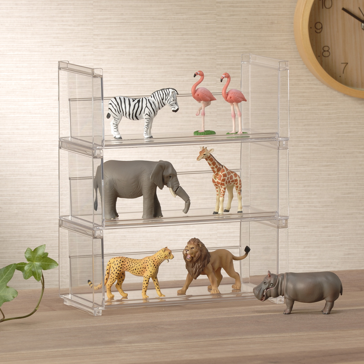 クリアなスチロール樹脂製なので、ラック自体が目立ちにくく、飾る物を主役にしたディスプレイが楽しめます。お部屋やデスク周りにも自然になじみます。