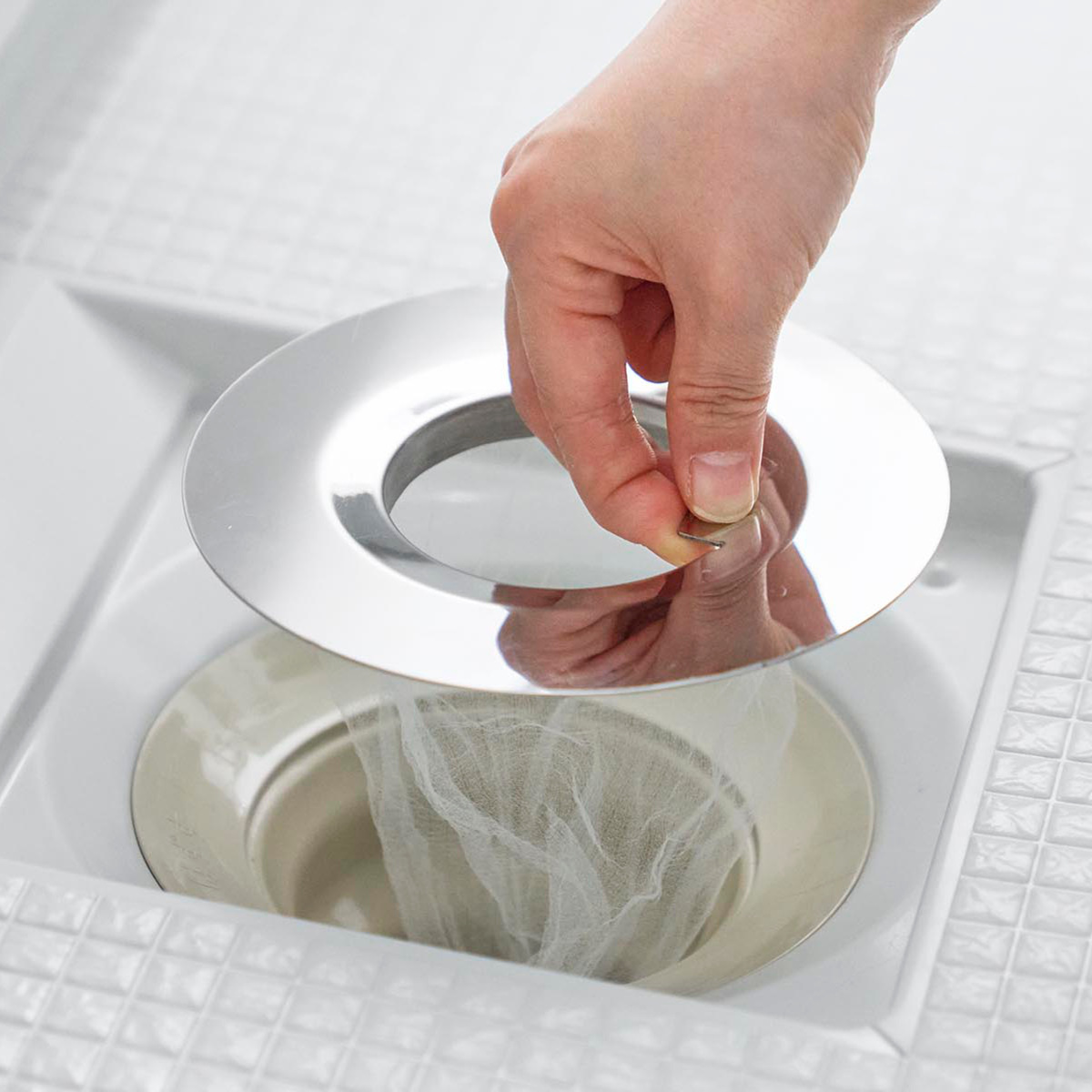 ●汚れた水切りネットにできるだけ触れずに交換できる、浴室用排水口ネットホルダーです。