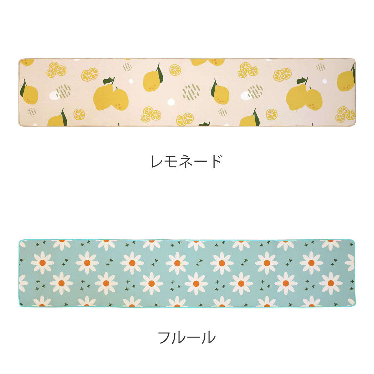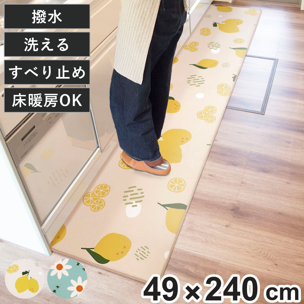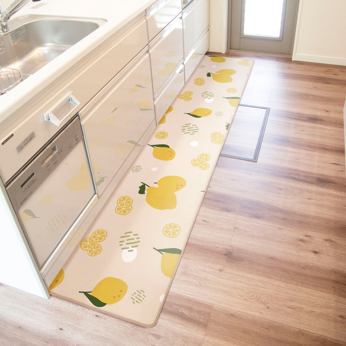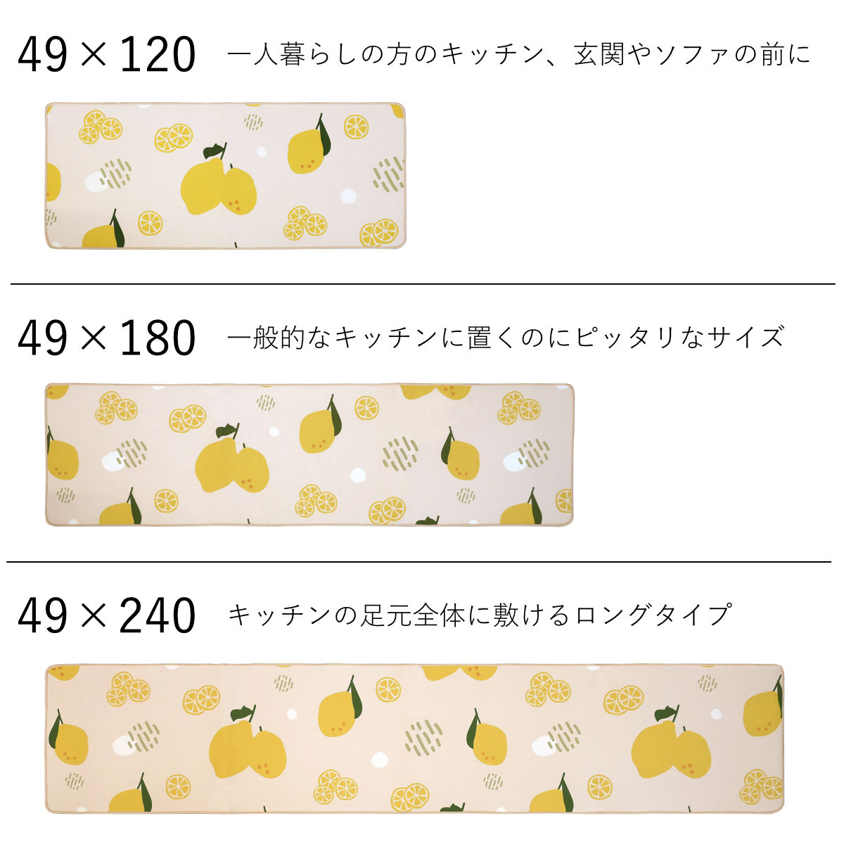 爽やかなレトロデザインのキッチンマット 49×240cmレトロ感のあるレモン柄と花柄がお洒落なマットです。キッチンはもちろん、玄関やベッド横、ソファ下など、お部屋のアクセントとしてもご使用いただけます。