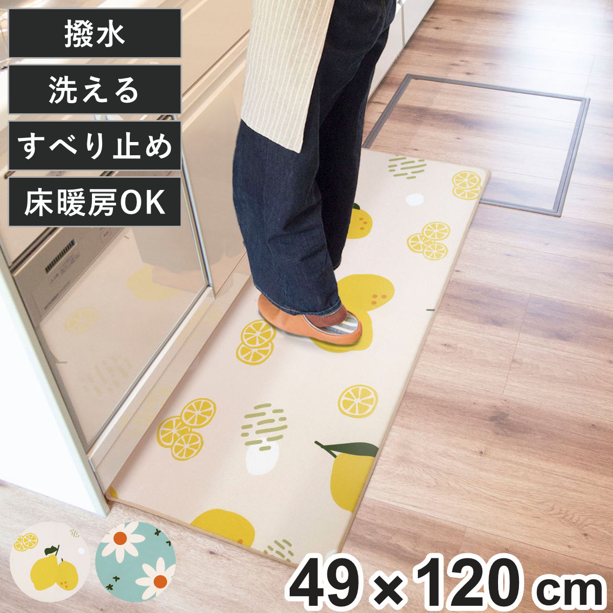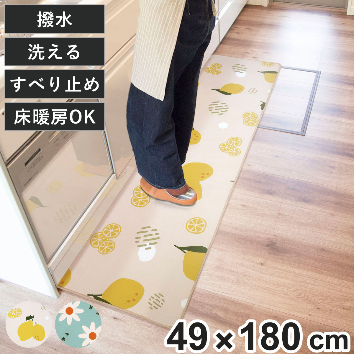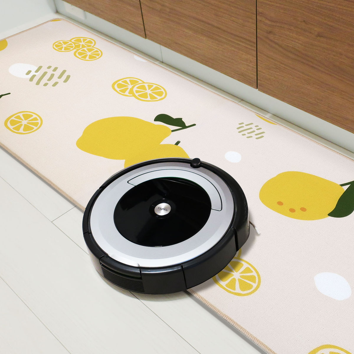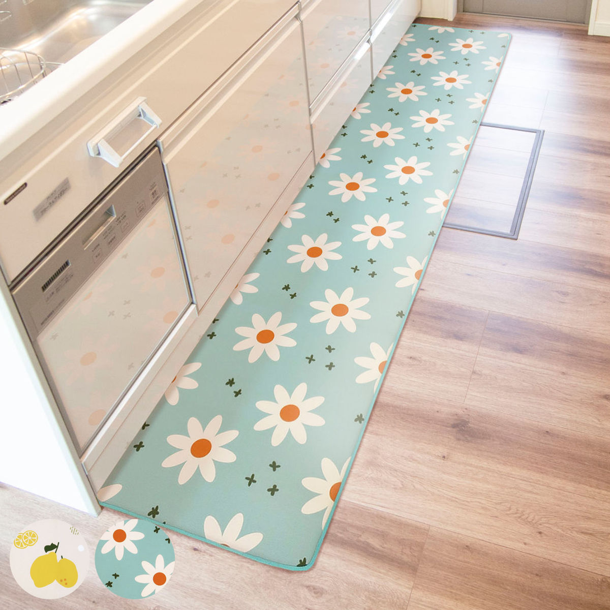 爽やかなレトロデザインのキッチンマット 49×240cmレトロ感のあるレモン柄と花柄がお洒落なマットです。キッチンはもちろん、玄関やベッド横、ソファ下など、お部屋のアクセントとしてもご使用いただけます。